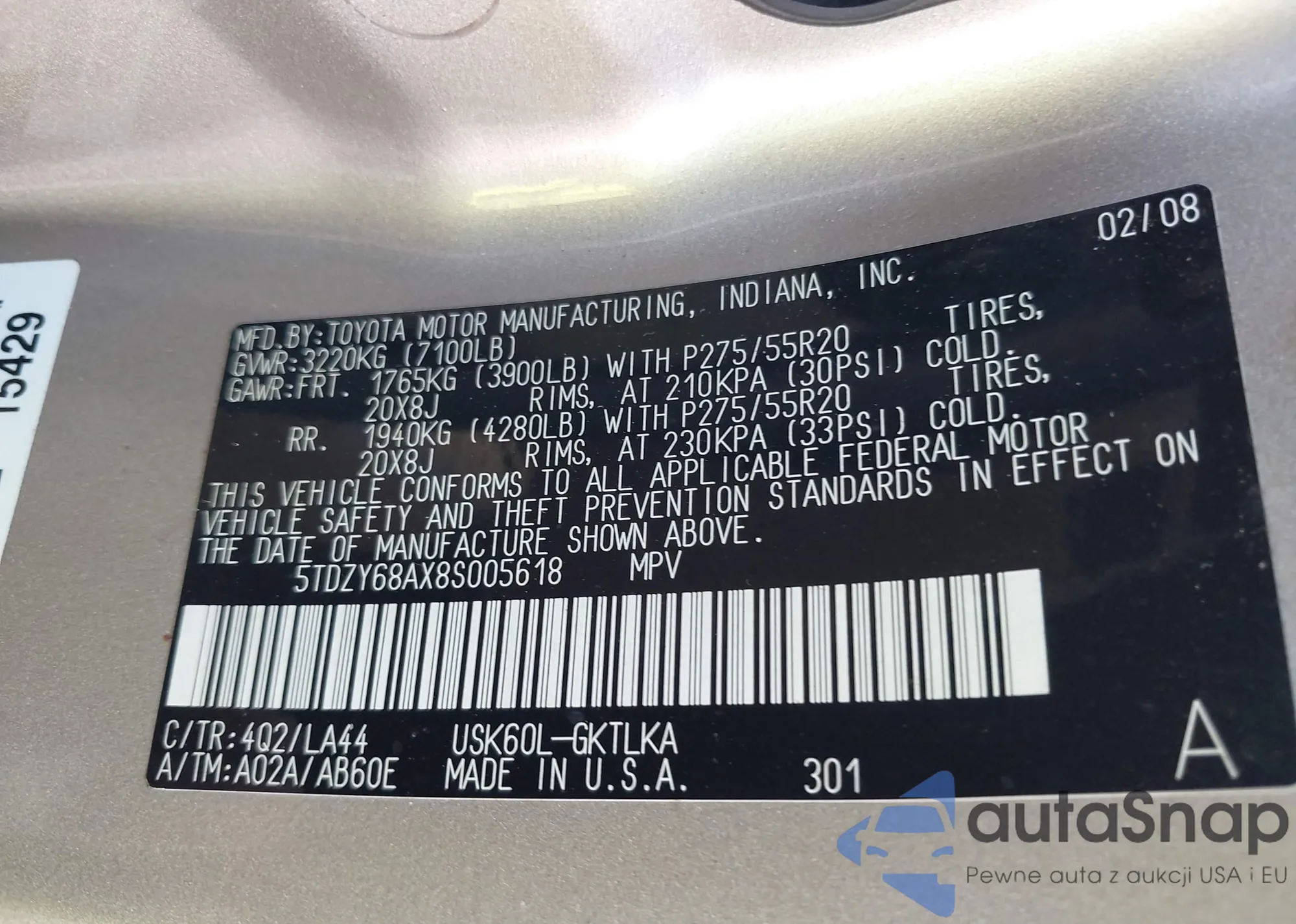 LOT: 43450949 VIN: 5TDZY68AX8S005618