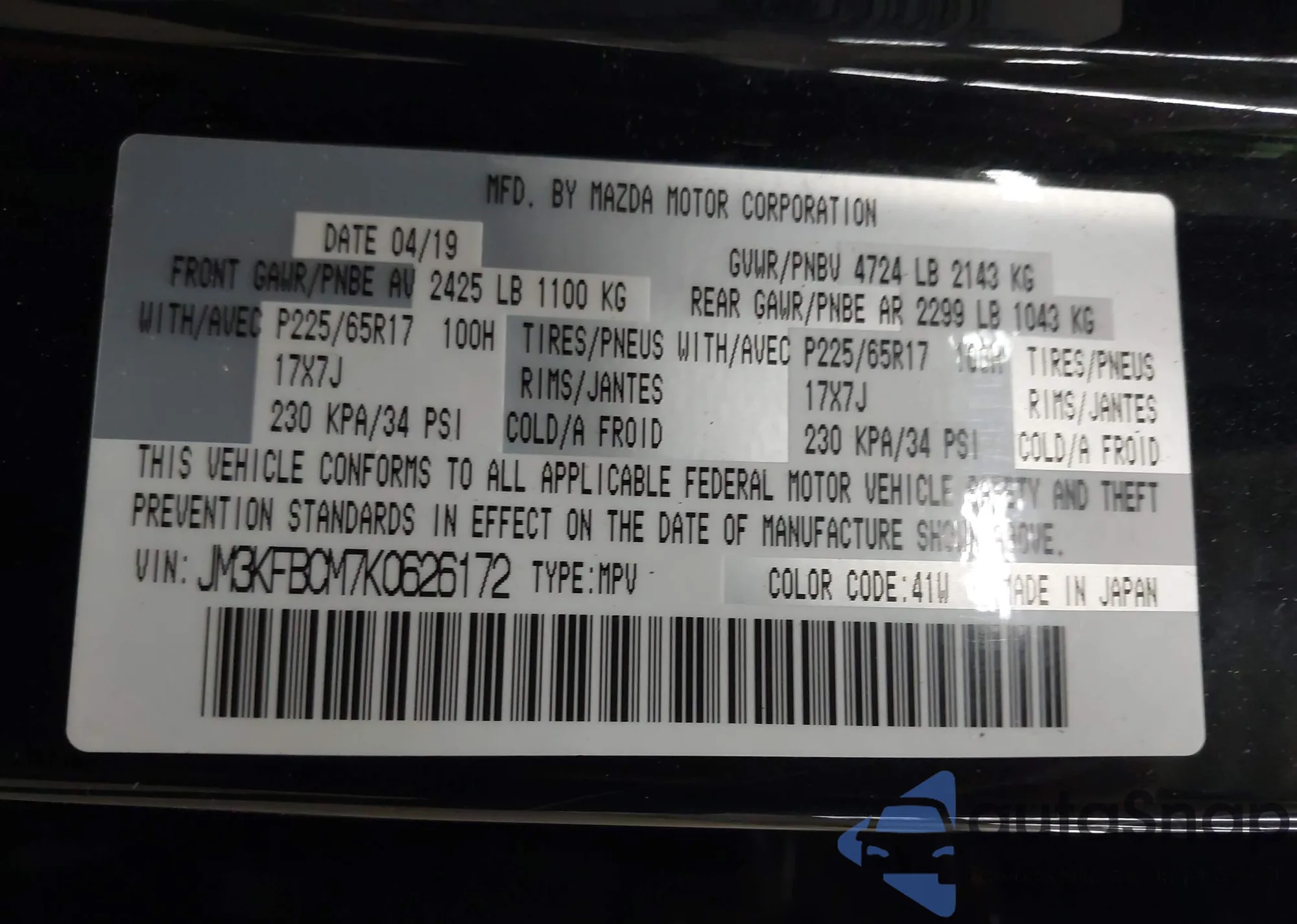 LOT: 43385656 VIN: JM3KFBCM7K0626172