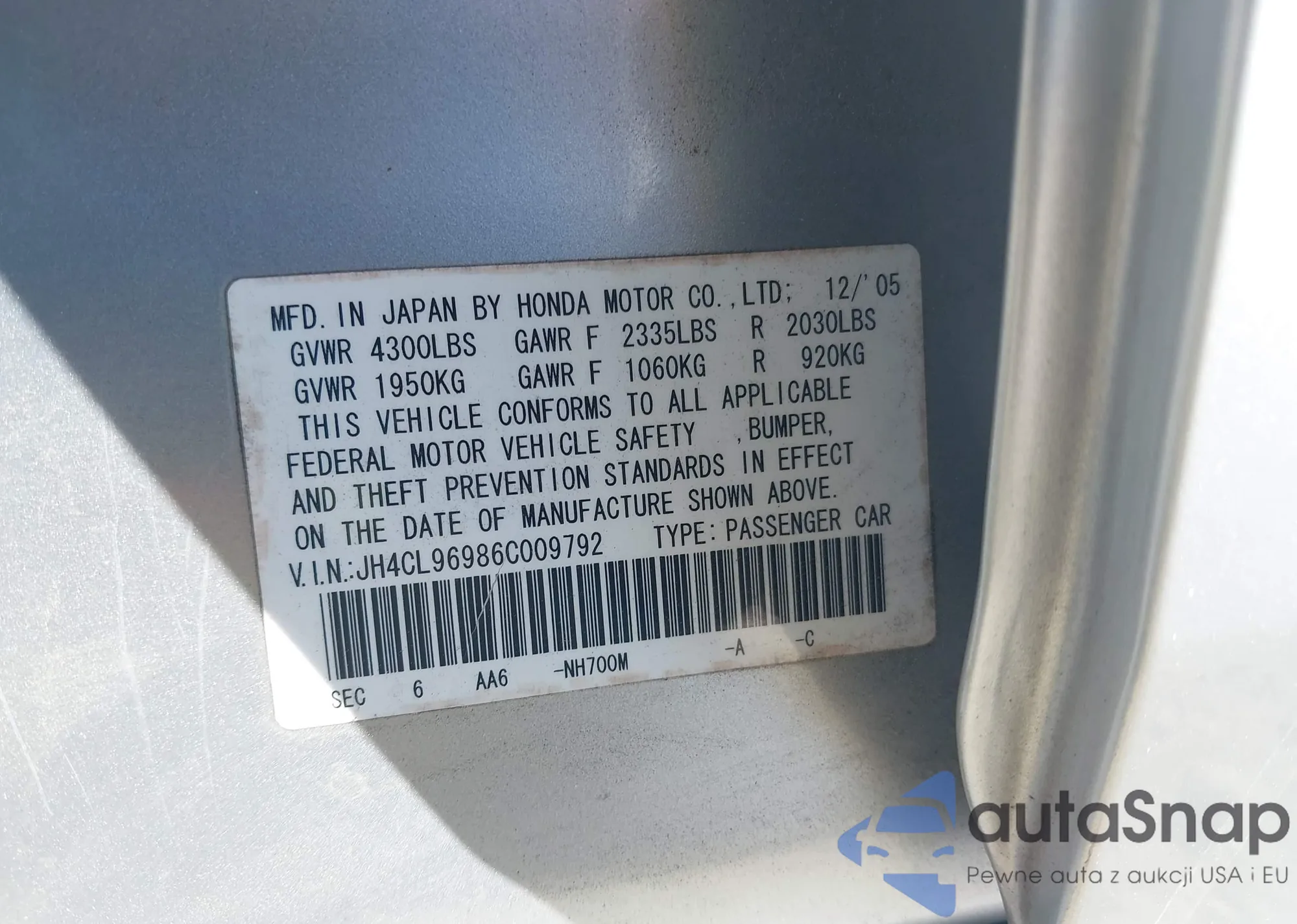 LOT: 43445899 VIN: JH4CL96986C009792
