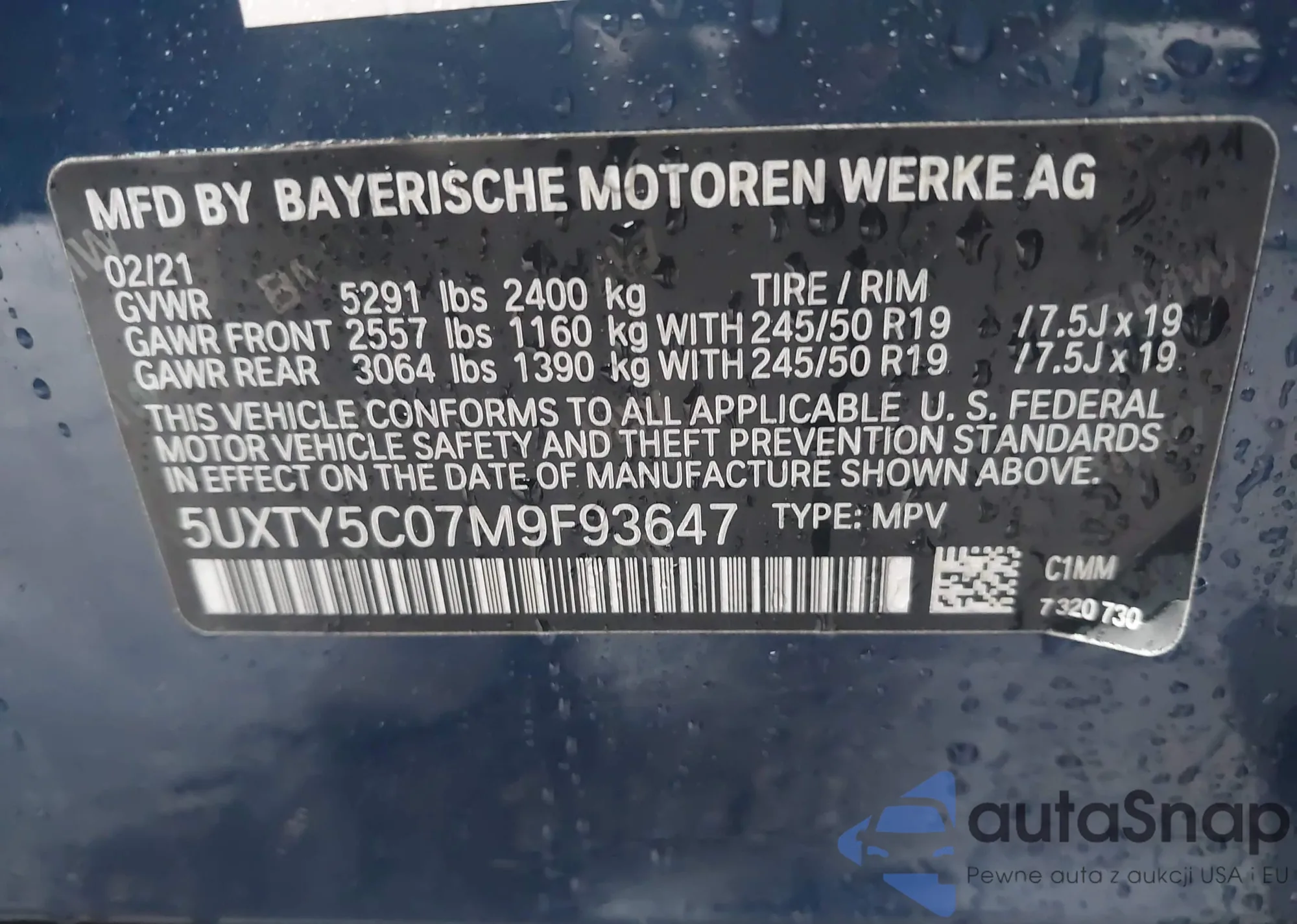 LOT: 43544650 VIN: 5UXTY5C07M9F93647