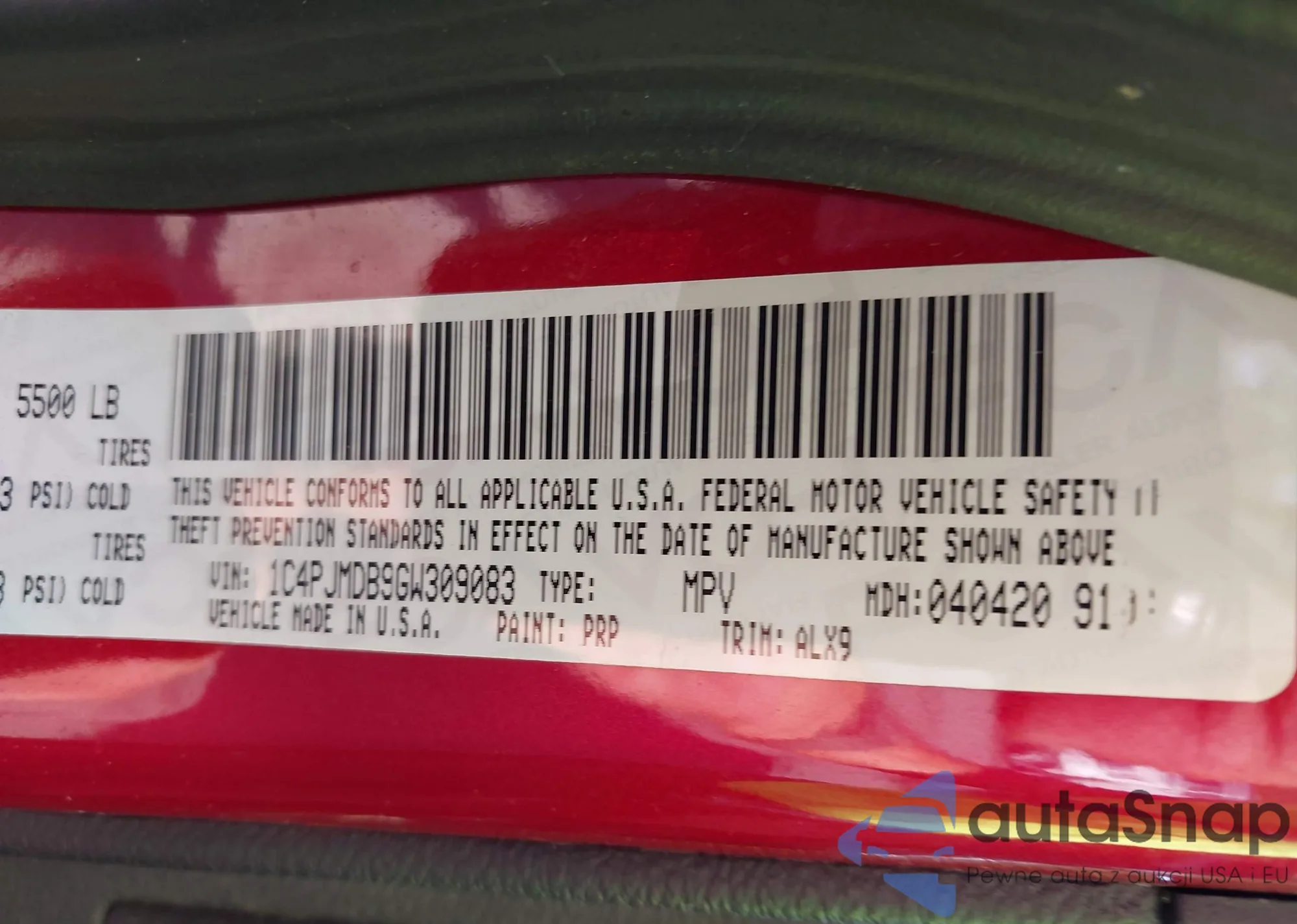 LOT: 43190465 VIN: 1C4PJMDB9GW309083