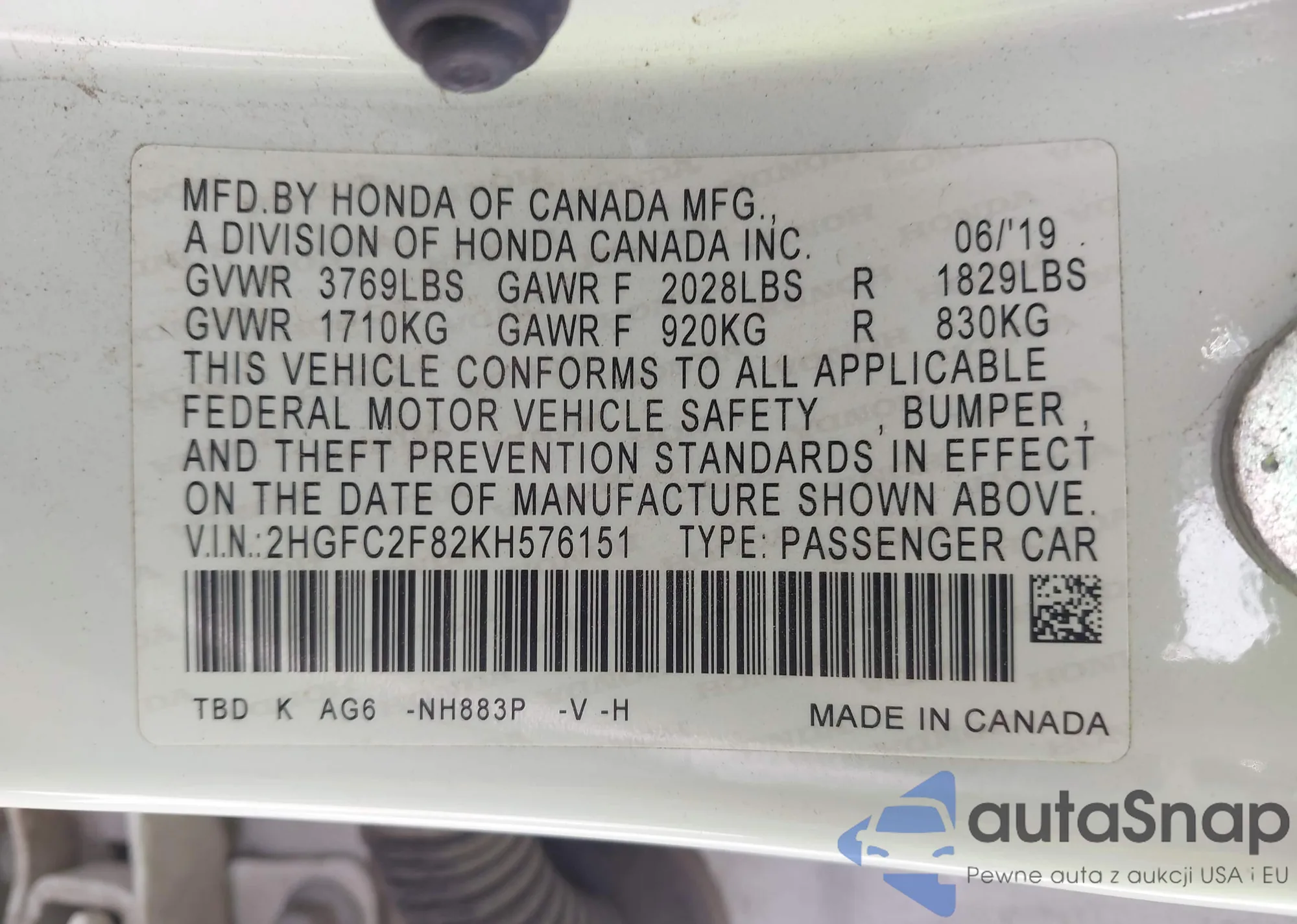 • VIN 2HGFC2F82KH576151