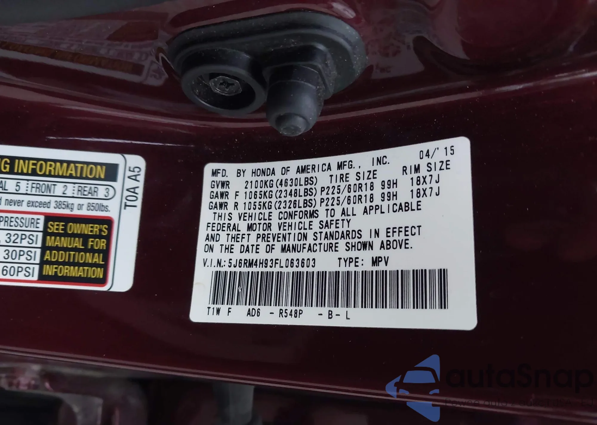• VIN 5J6RM4H93FL063603