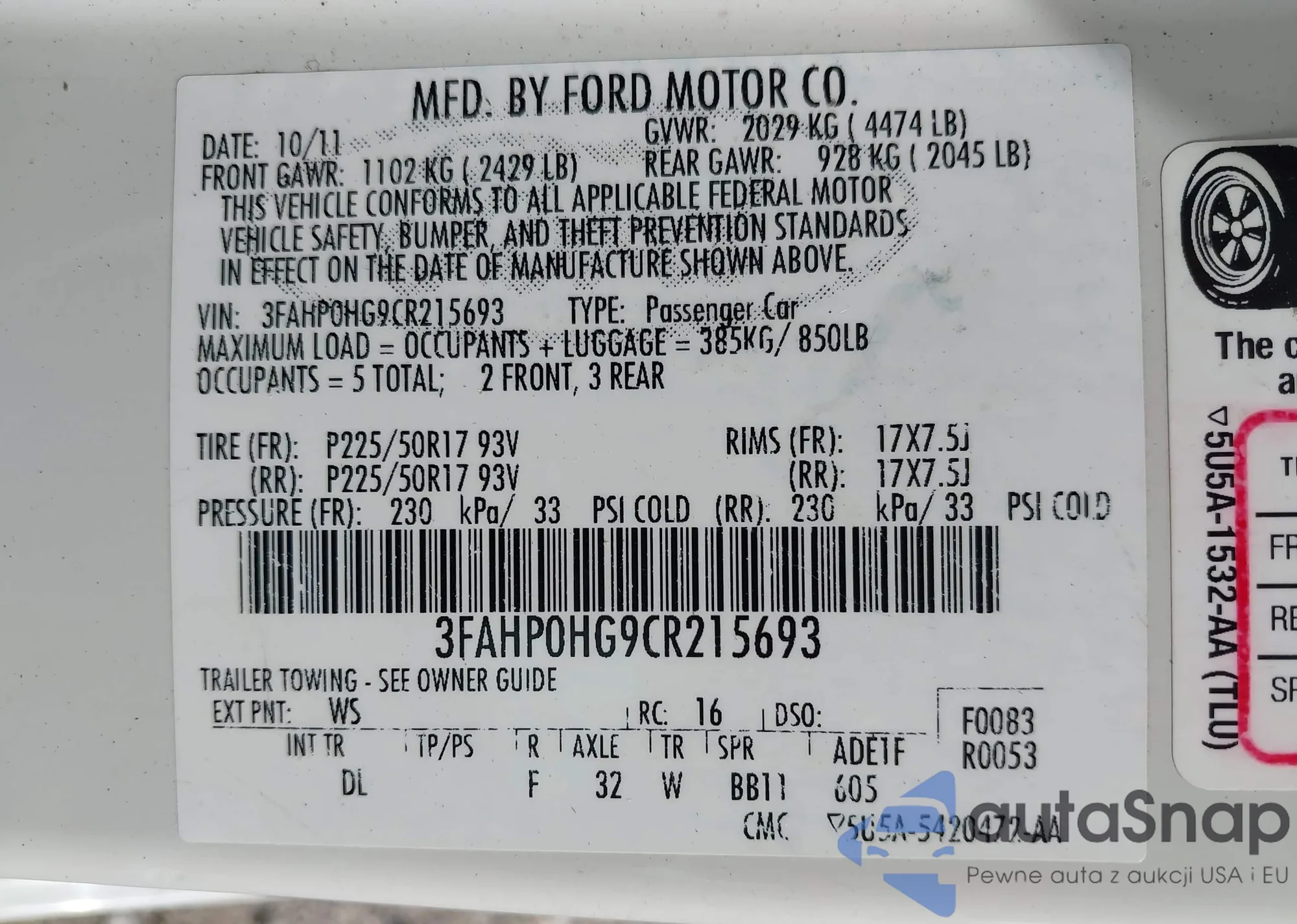 • VIN 3FAHP0HG9CR215693