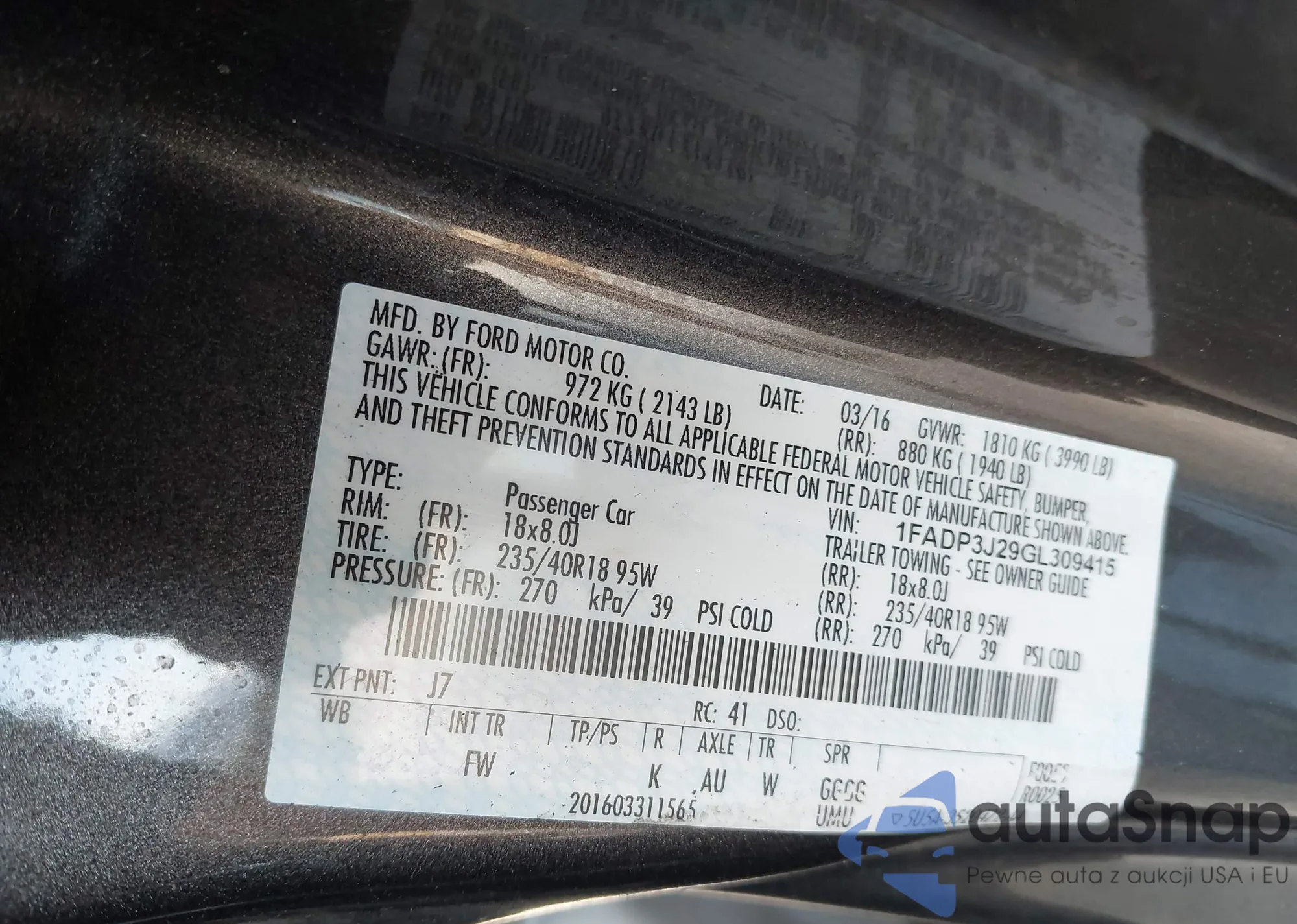 • VIN 1FADP3J29GL309415