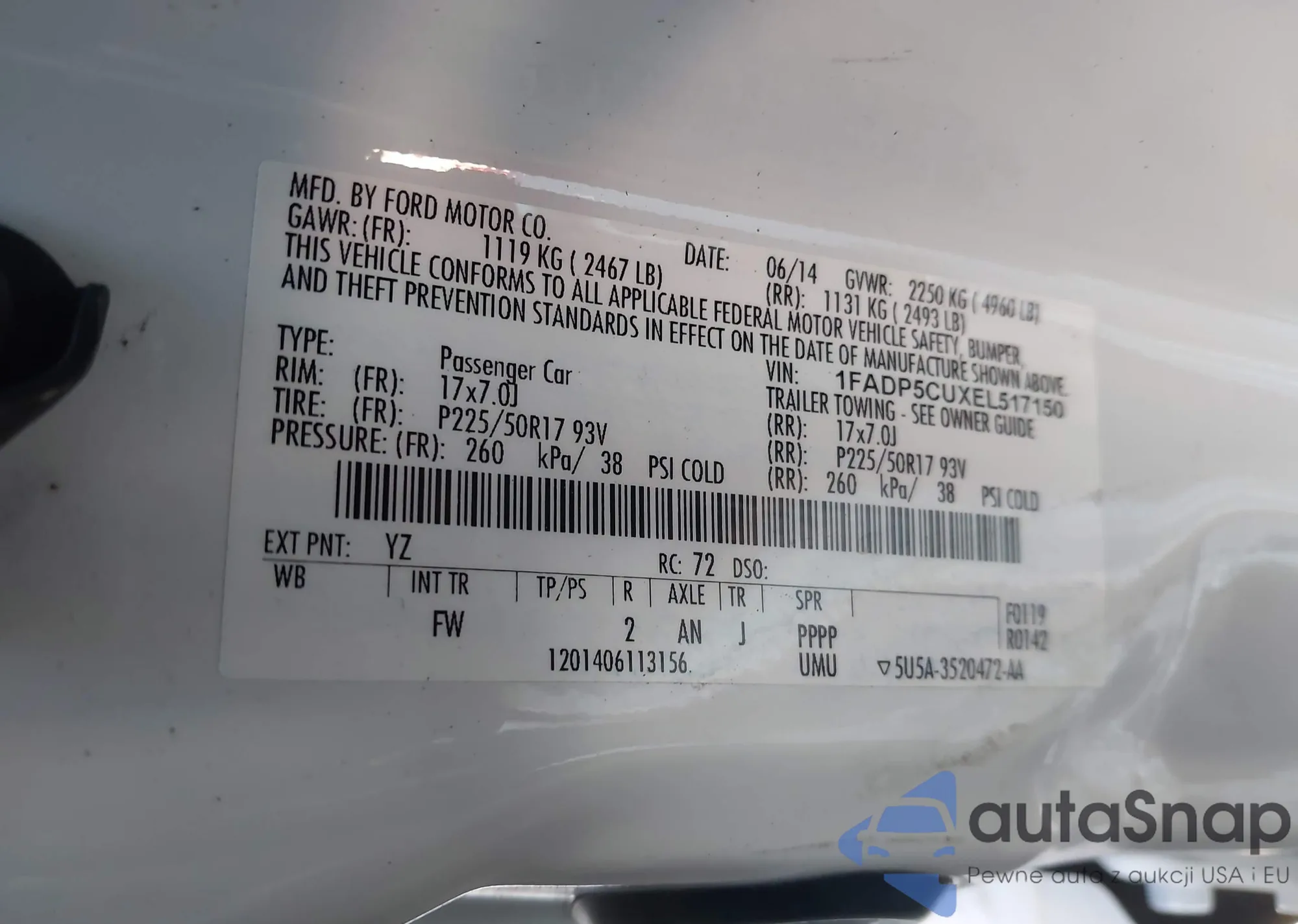 LOT: 43346222 VIN: 1FADP5CUXEL517150