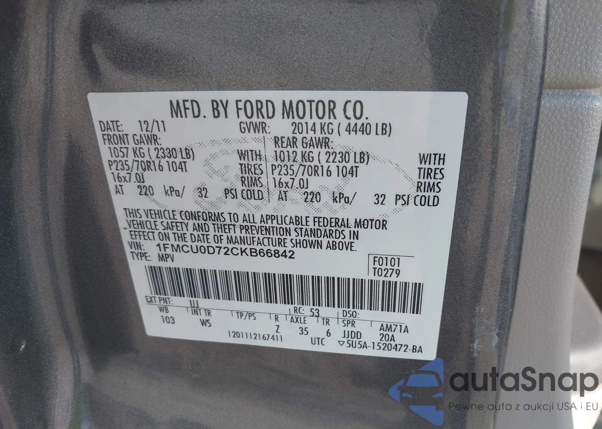 LOT: 43422261 VIN: 1FMCU9DG9CKA04971