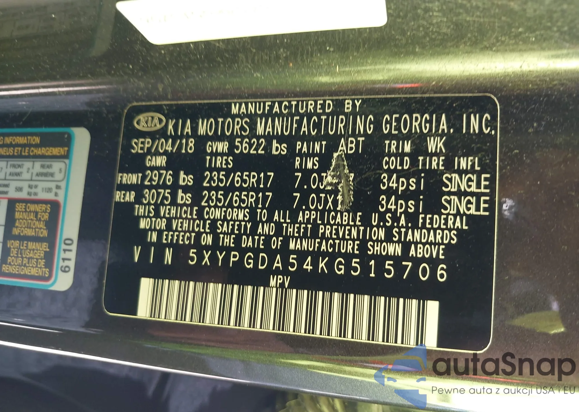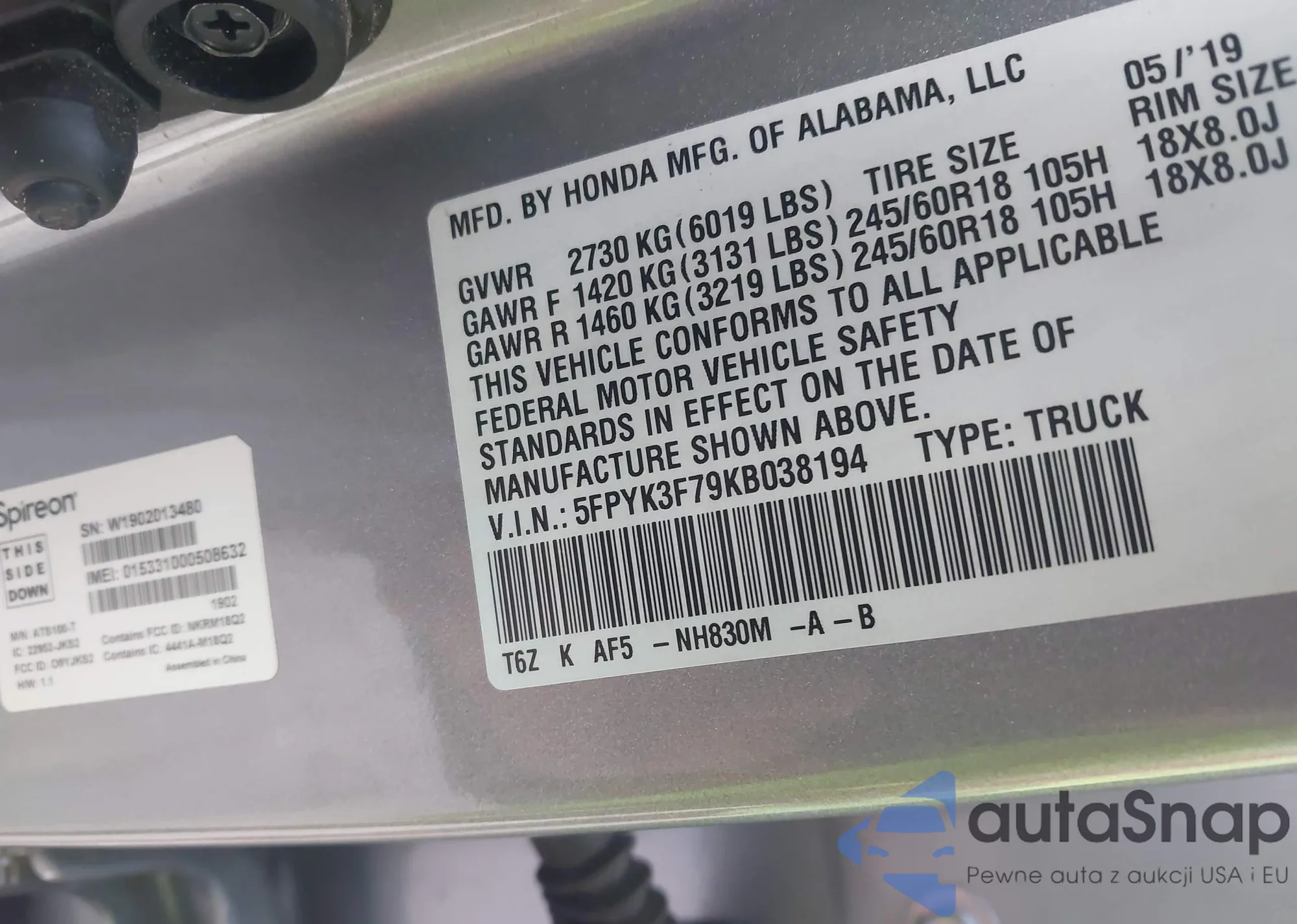 LOT: 43268278 VIN: 5FPYK3F79KB038194