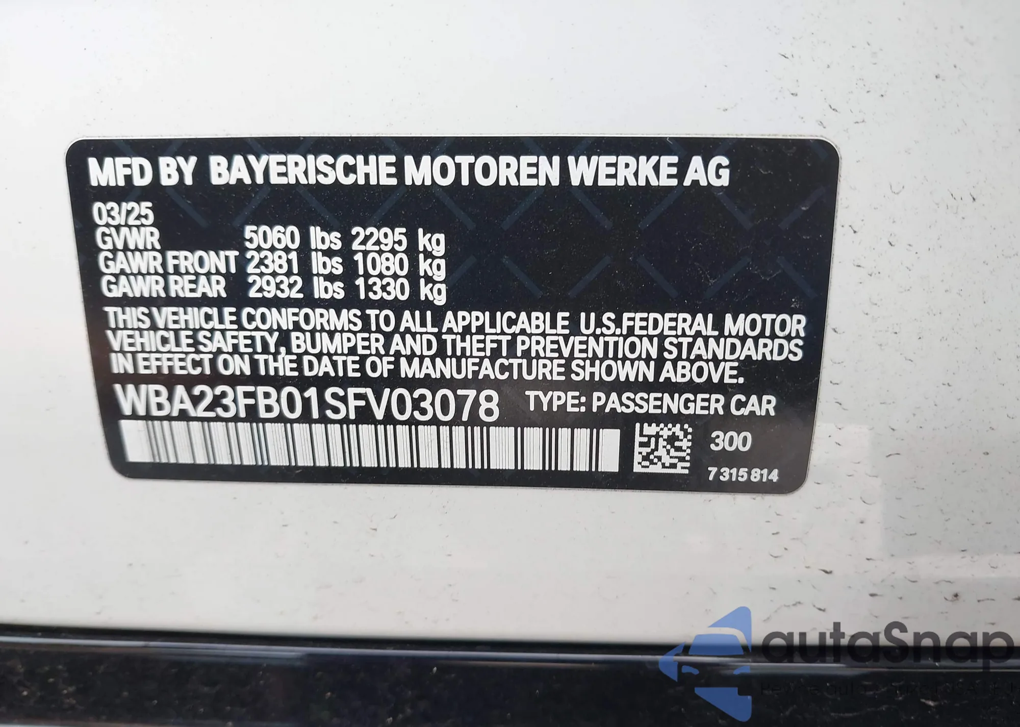 • VIN WBA23FB01SFV03078