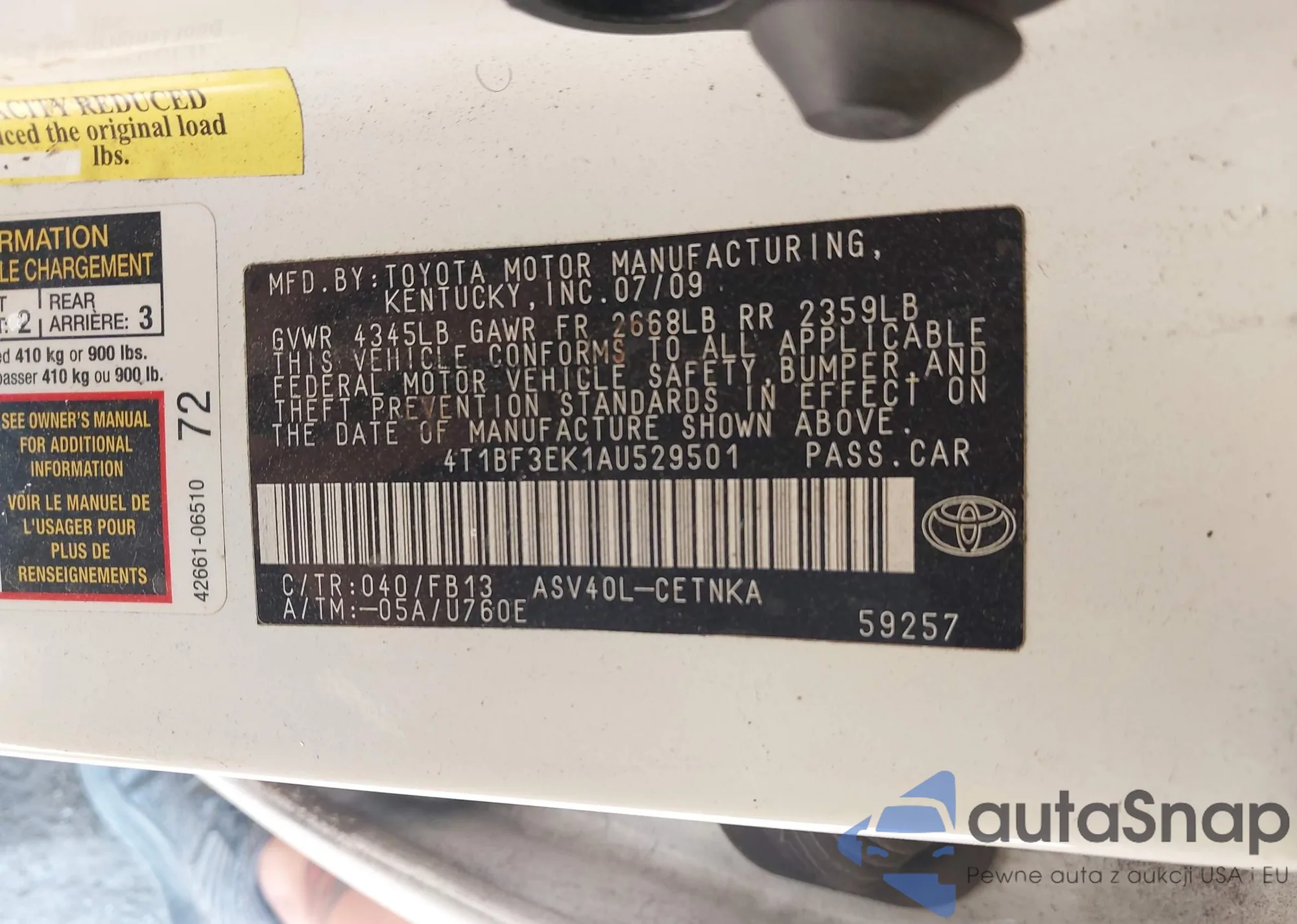• VIN 4T1BF3EK1AU529501