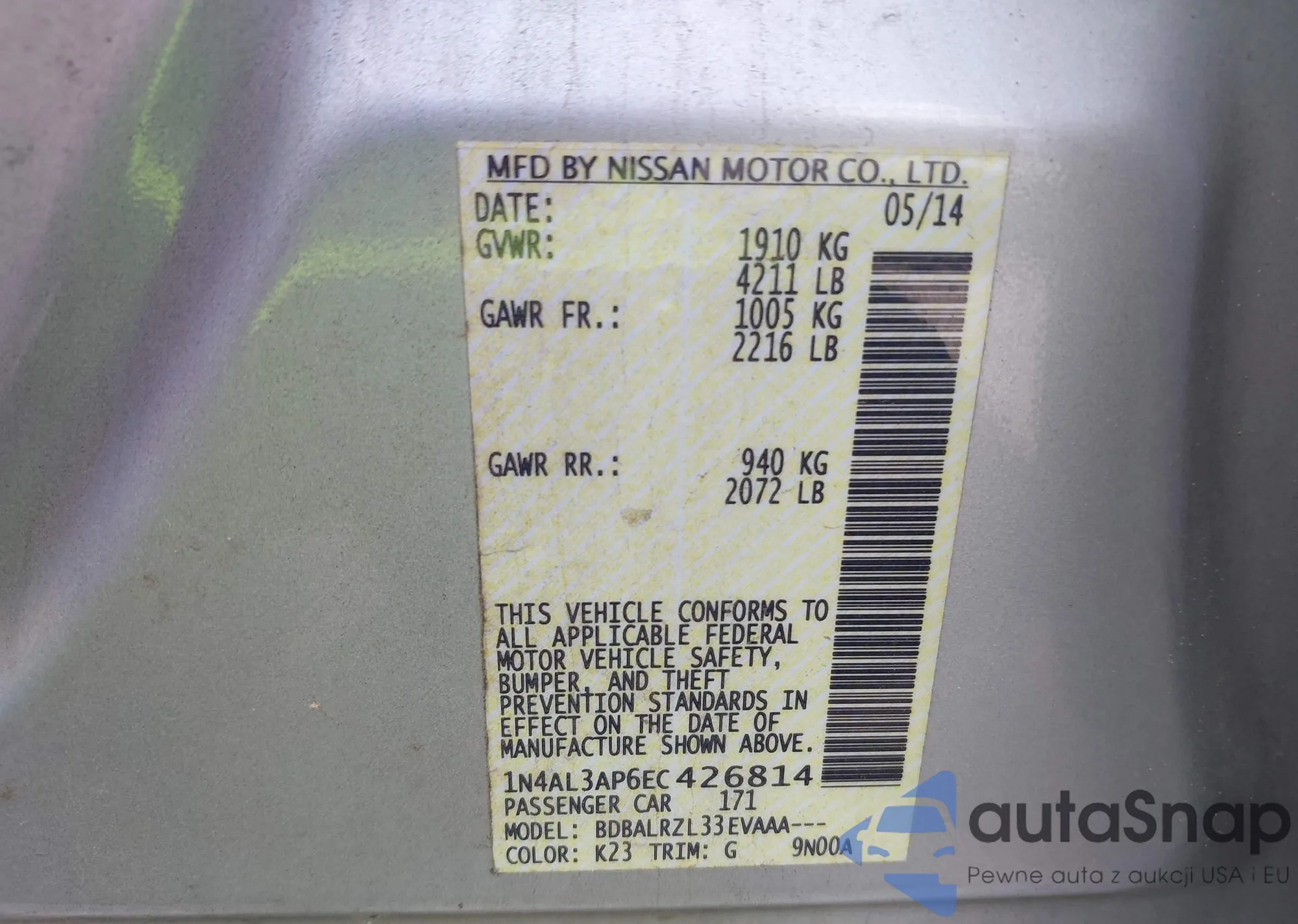 LOT: 43019493 VIN: JN8AF5MR1ET362485