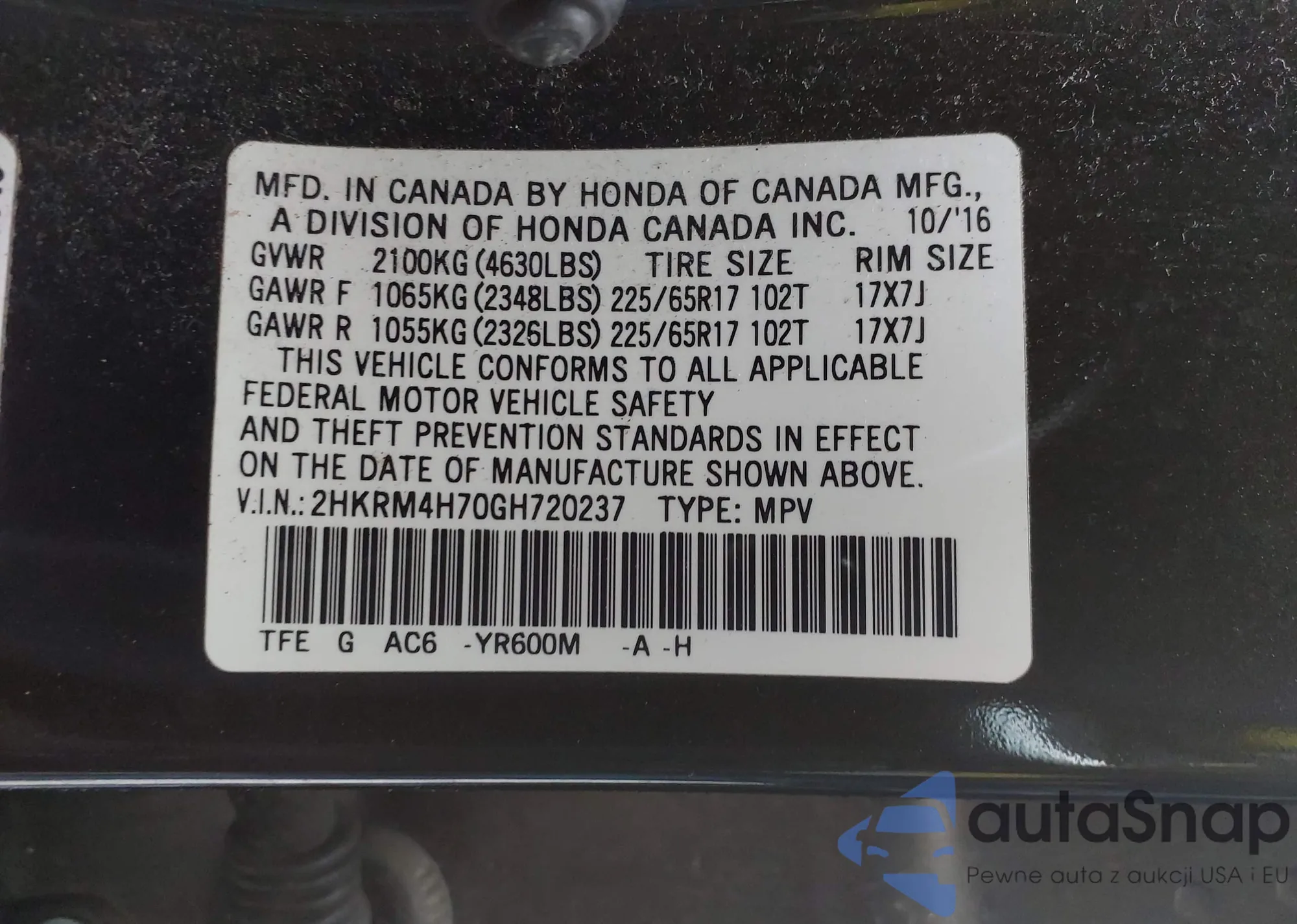 • VIN 2HKRM4H70GH720237