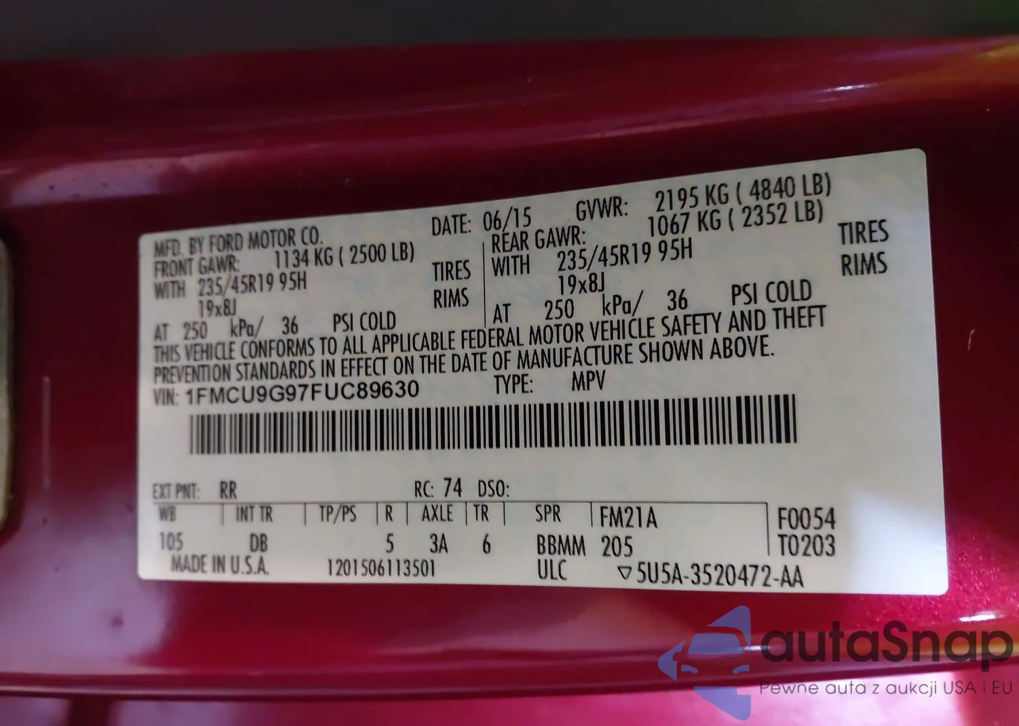 • VIN 3FA6P0LU8KR167798