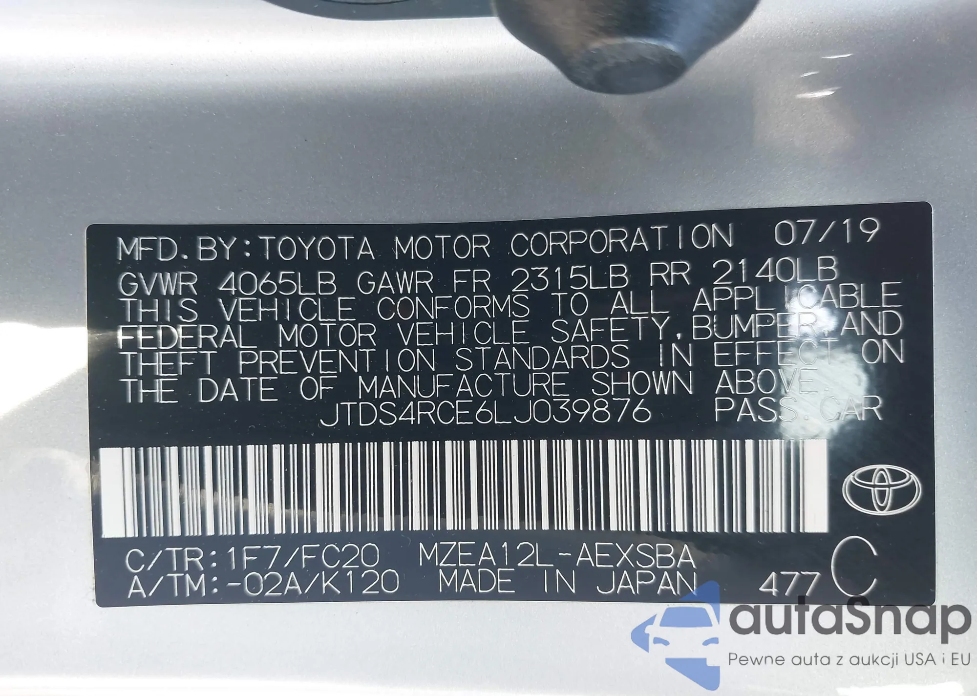 LOT: 43273635 VIN: JTDS4RCE6LJ039876