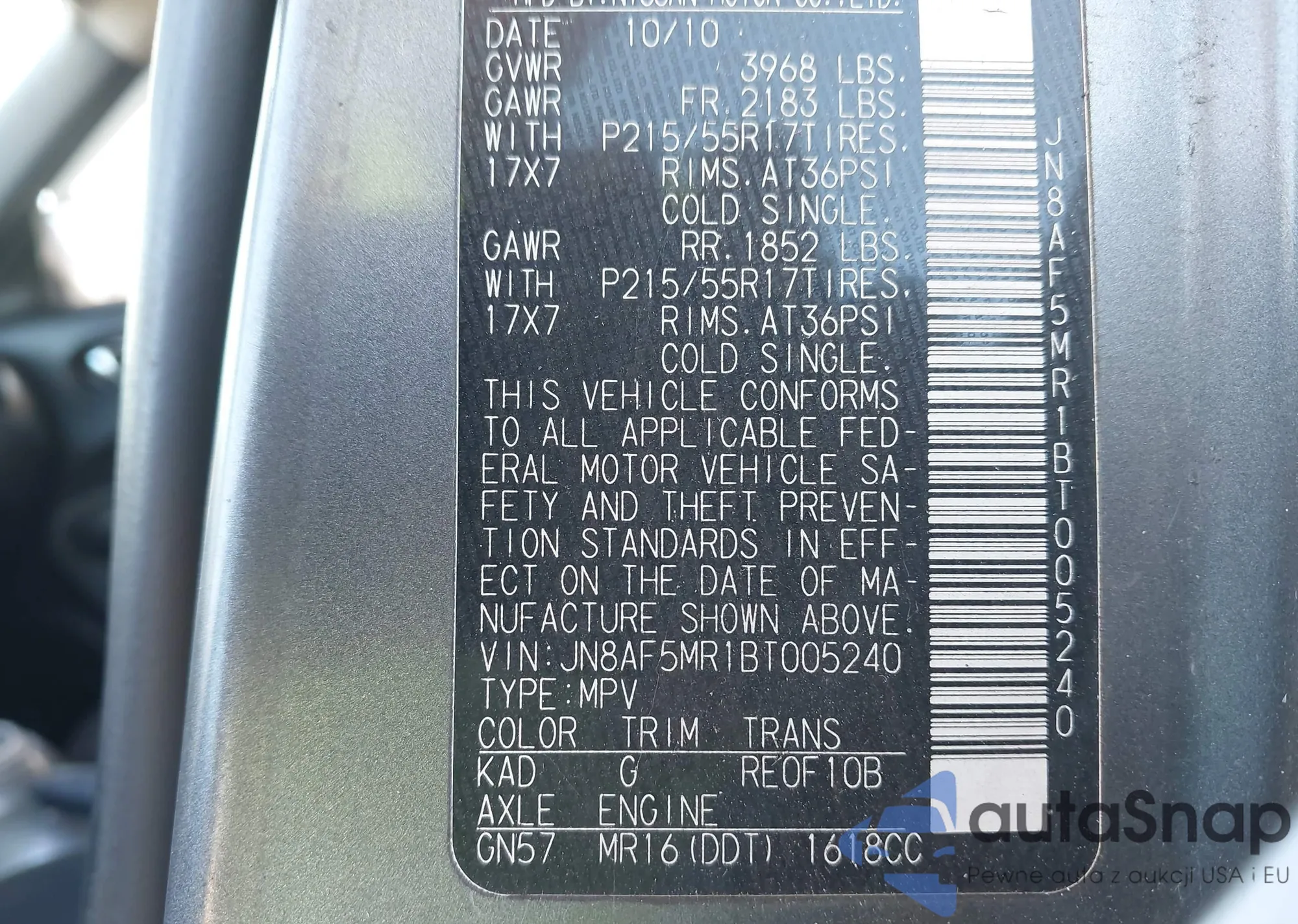 LOT: 43350287 VIN: JN8AF5MR1BT005240