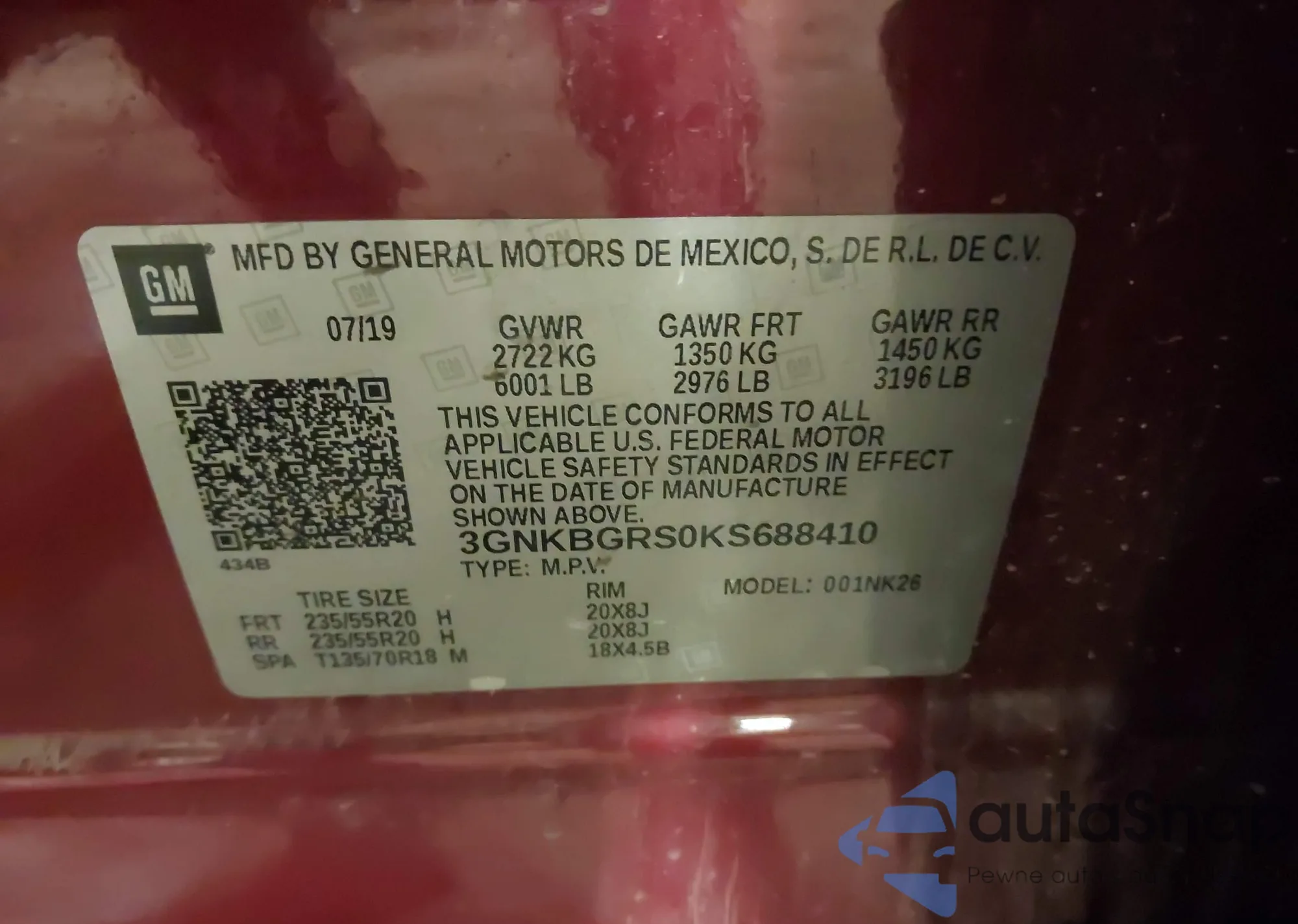 • VIN 3GNKBGRS0KS688410