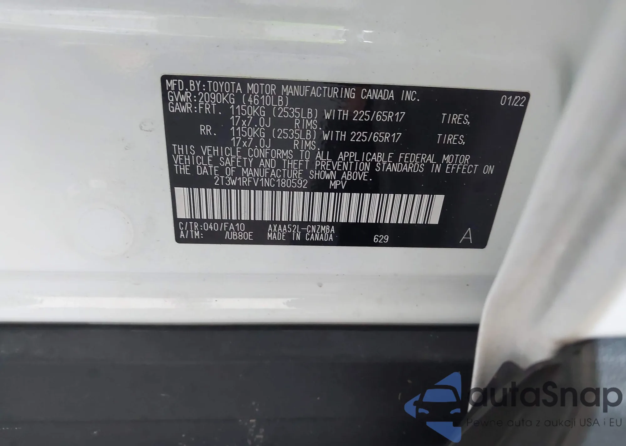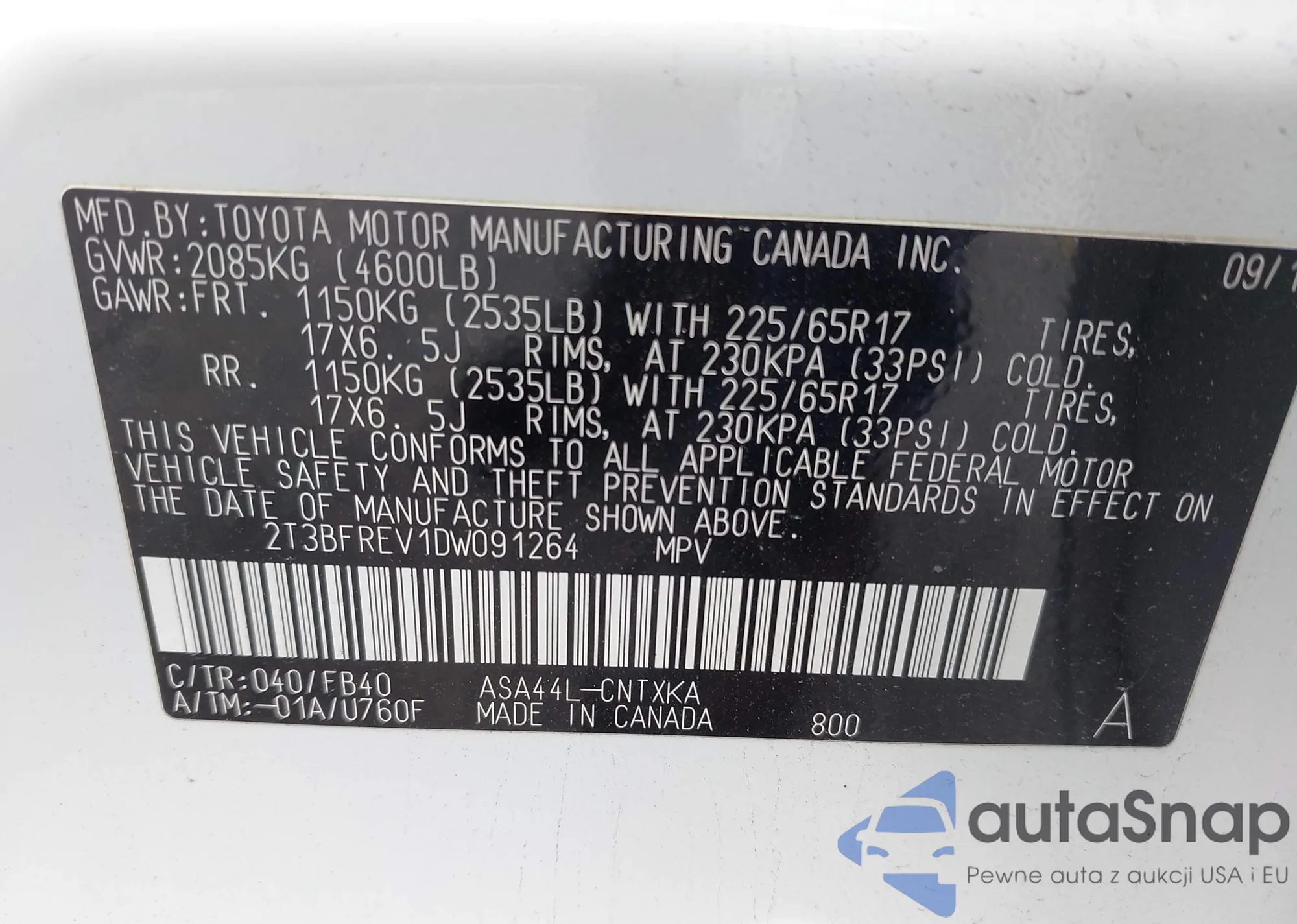 LOT: 43606446 VIN: 2T3BFREV1DW091264