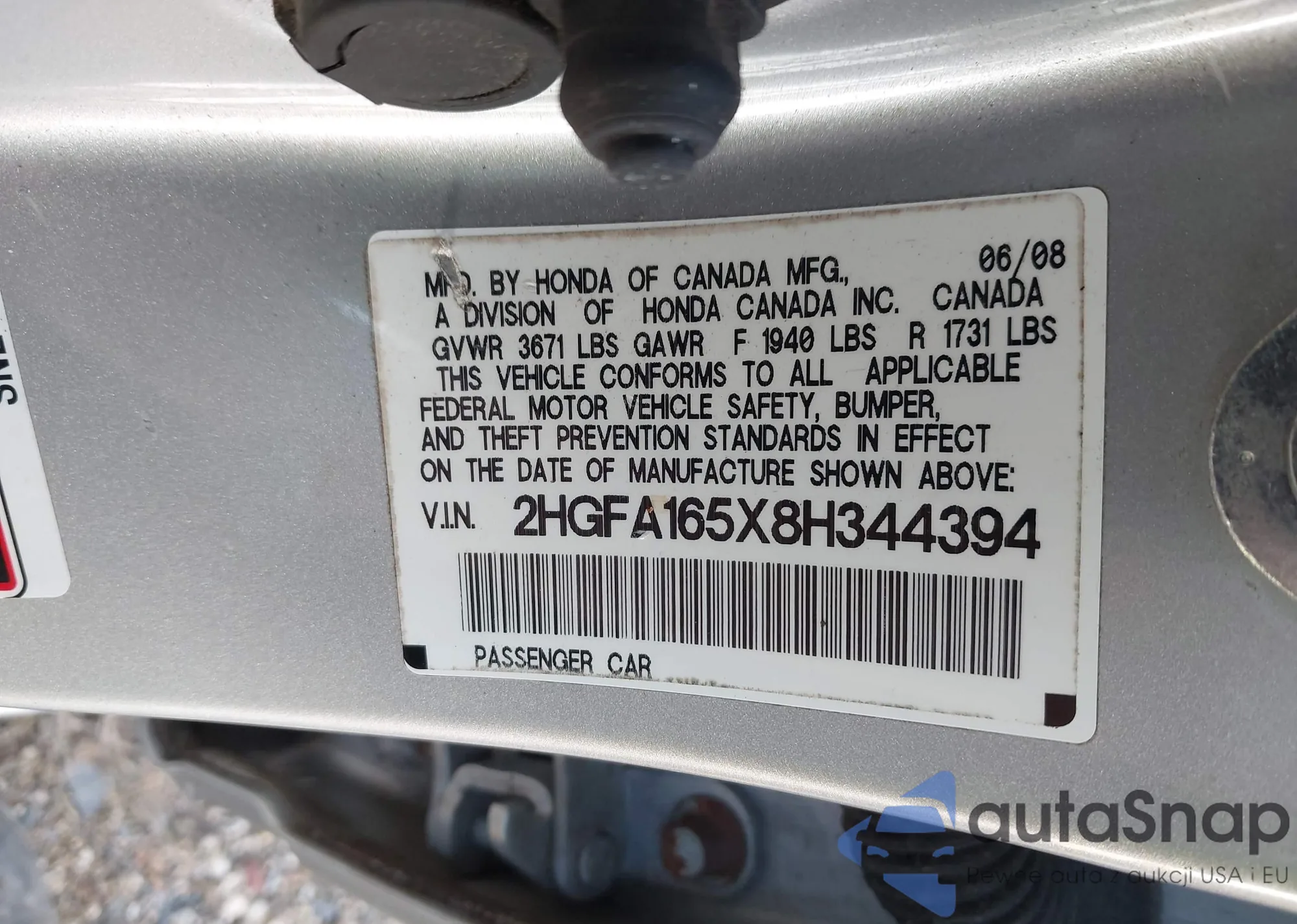 LOT: 43285048 VIN: 2HGFG12687H580702