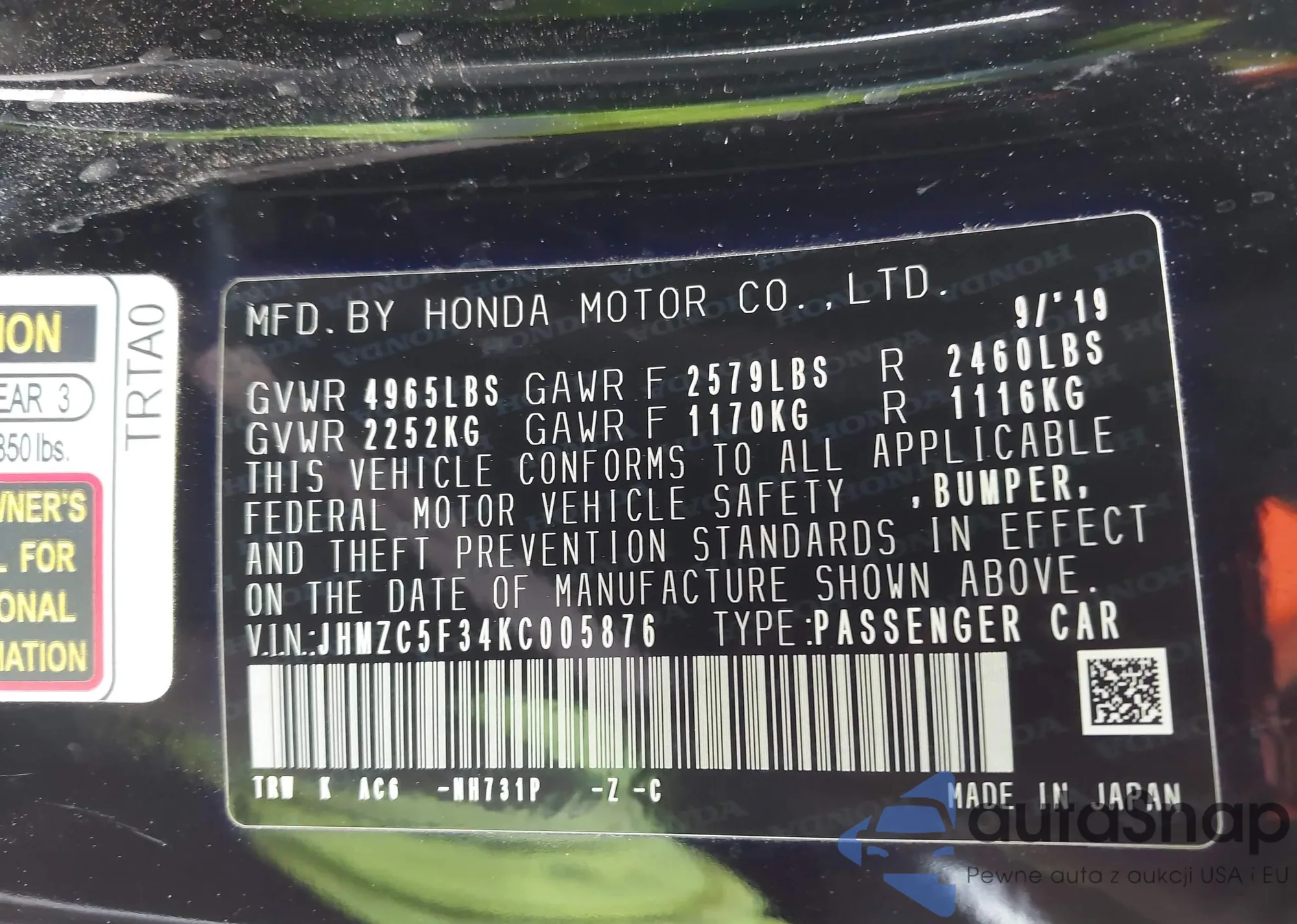 LOT: 43101467 VIN: JHMZC5F34KC005876