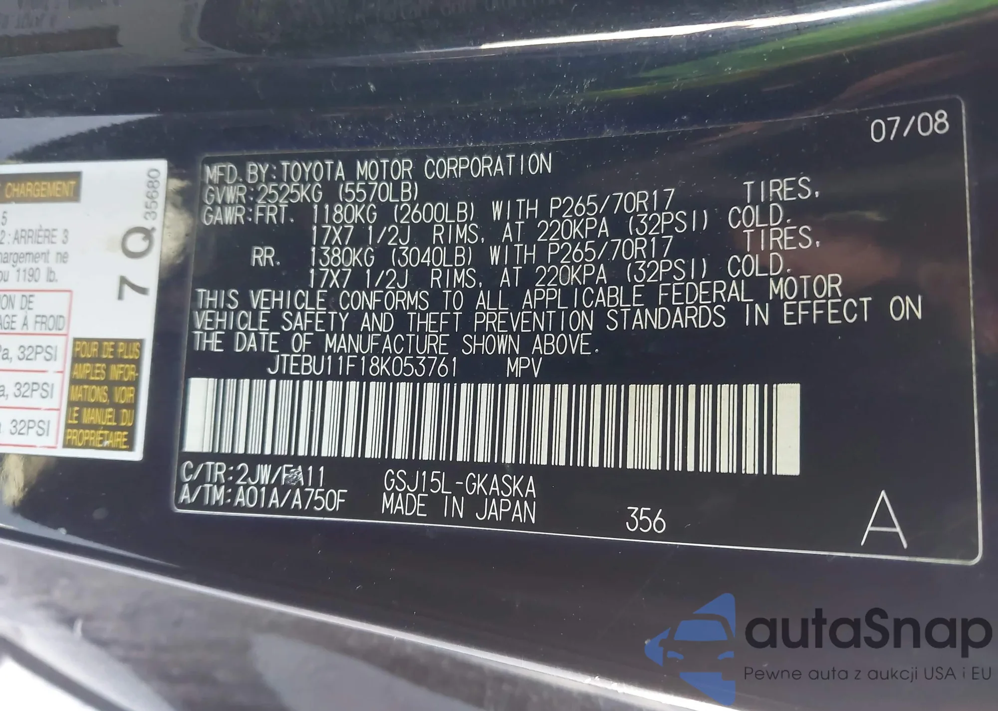 LOT: 43342125 VIN: JTEBU11F18K053761