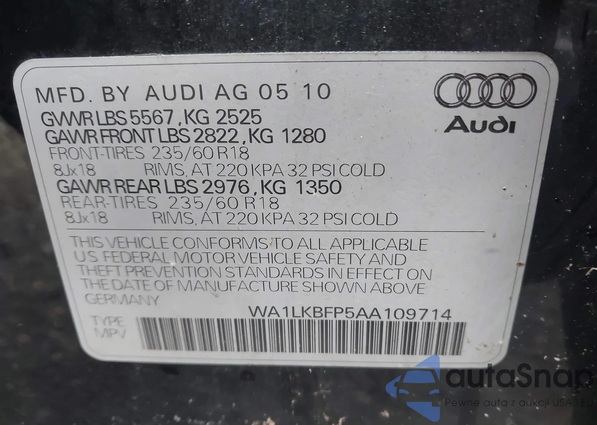 LOT: 43503478 VIN: WA1LKBFP5AA109714