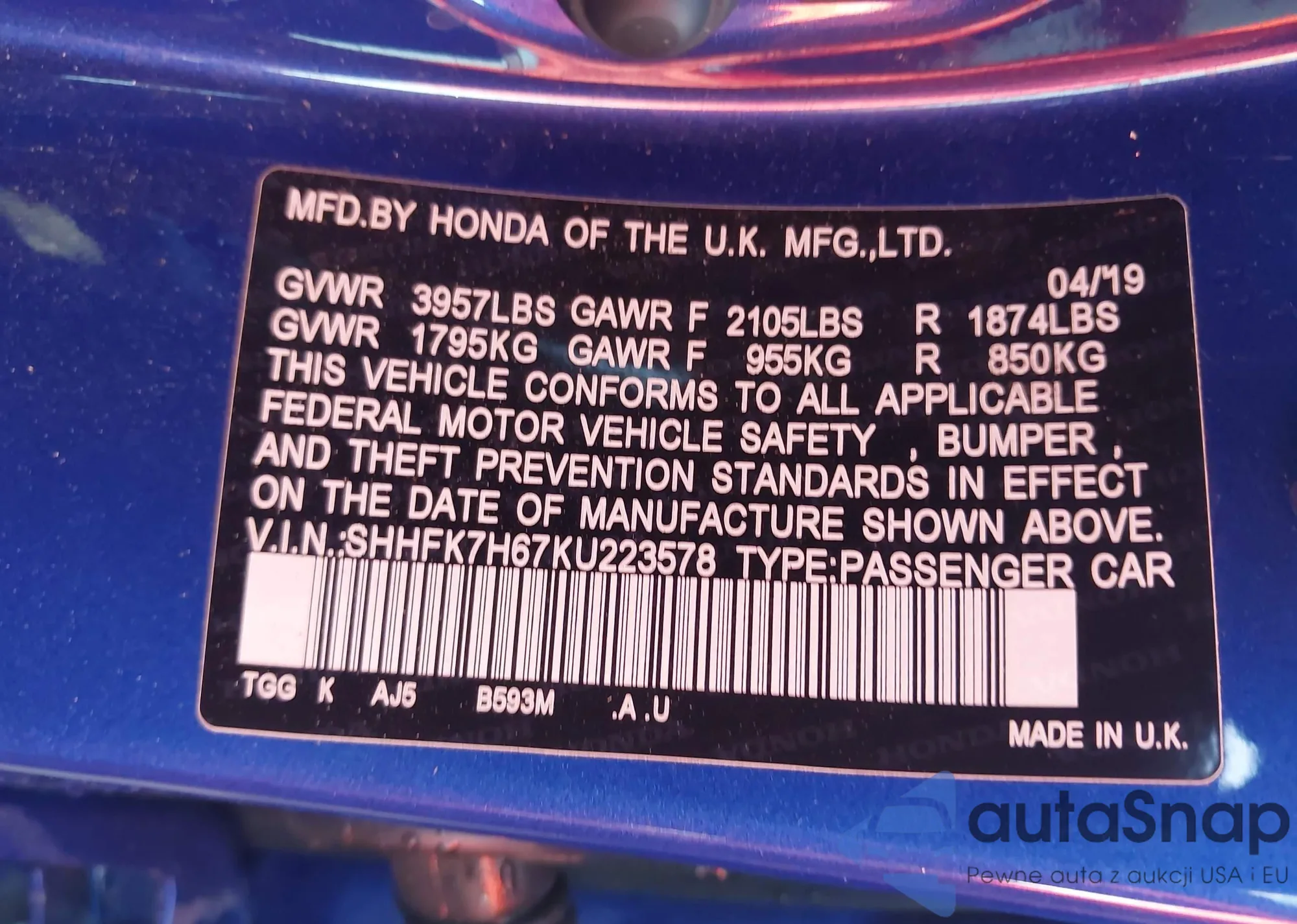 • VIN SHHFK7H67KU223578