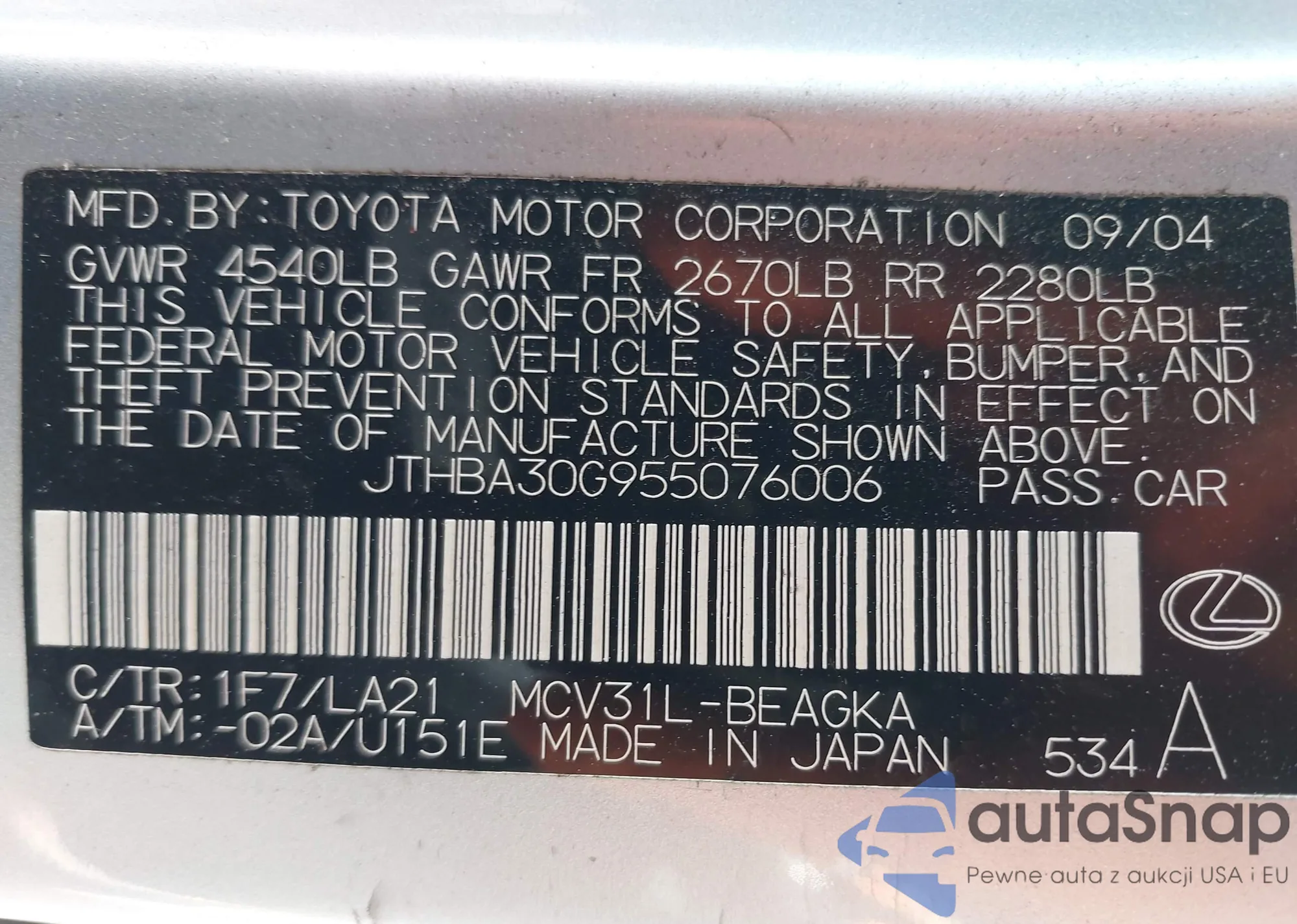 LOT: 43018212 VIN: JTHBA30G955076006