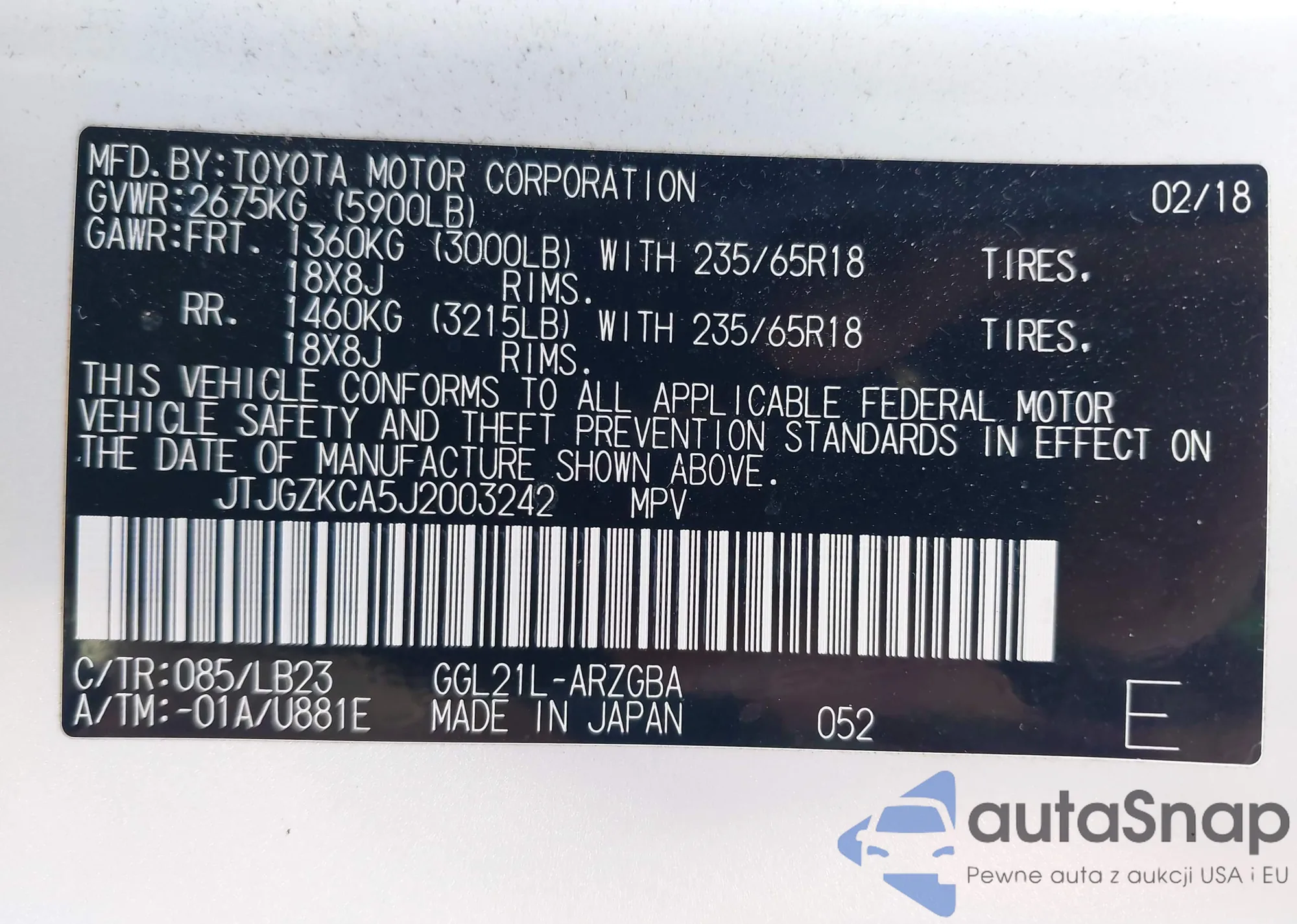 LOT: 43551814 VIN: JTJGZKCA5J2003242