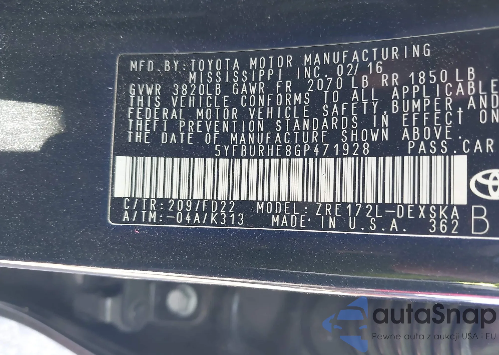 LOT: 43580508 VIN: 5N1AZ2MH2GN134281