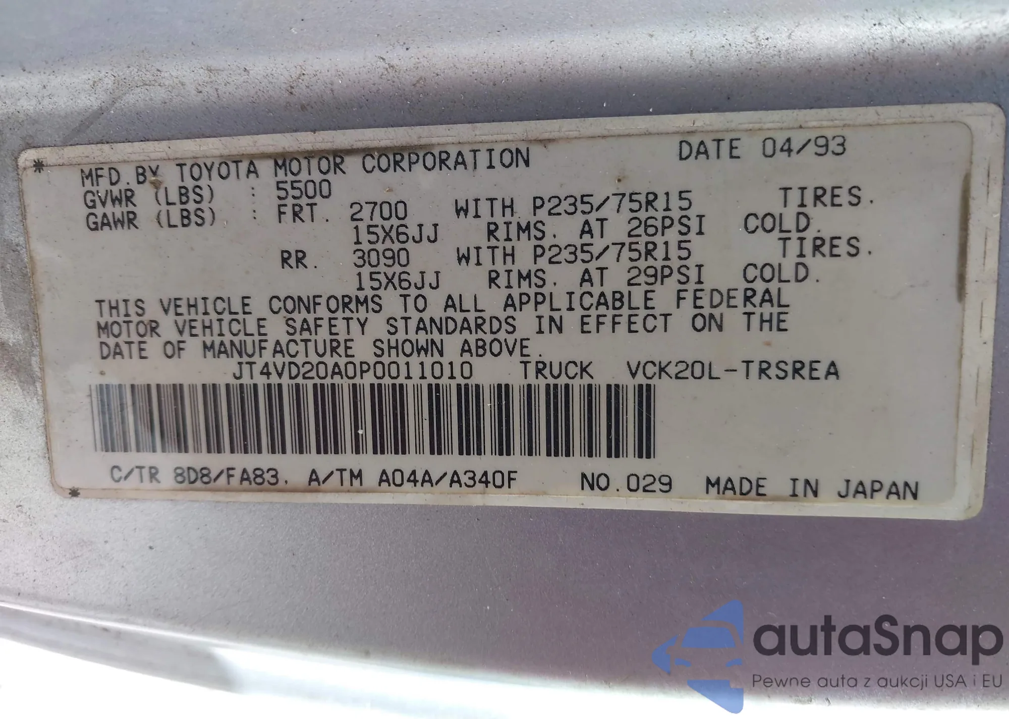 LOT: 43261254 VIN: JT4VD20A0P0011010