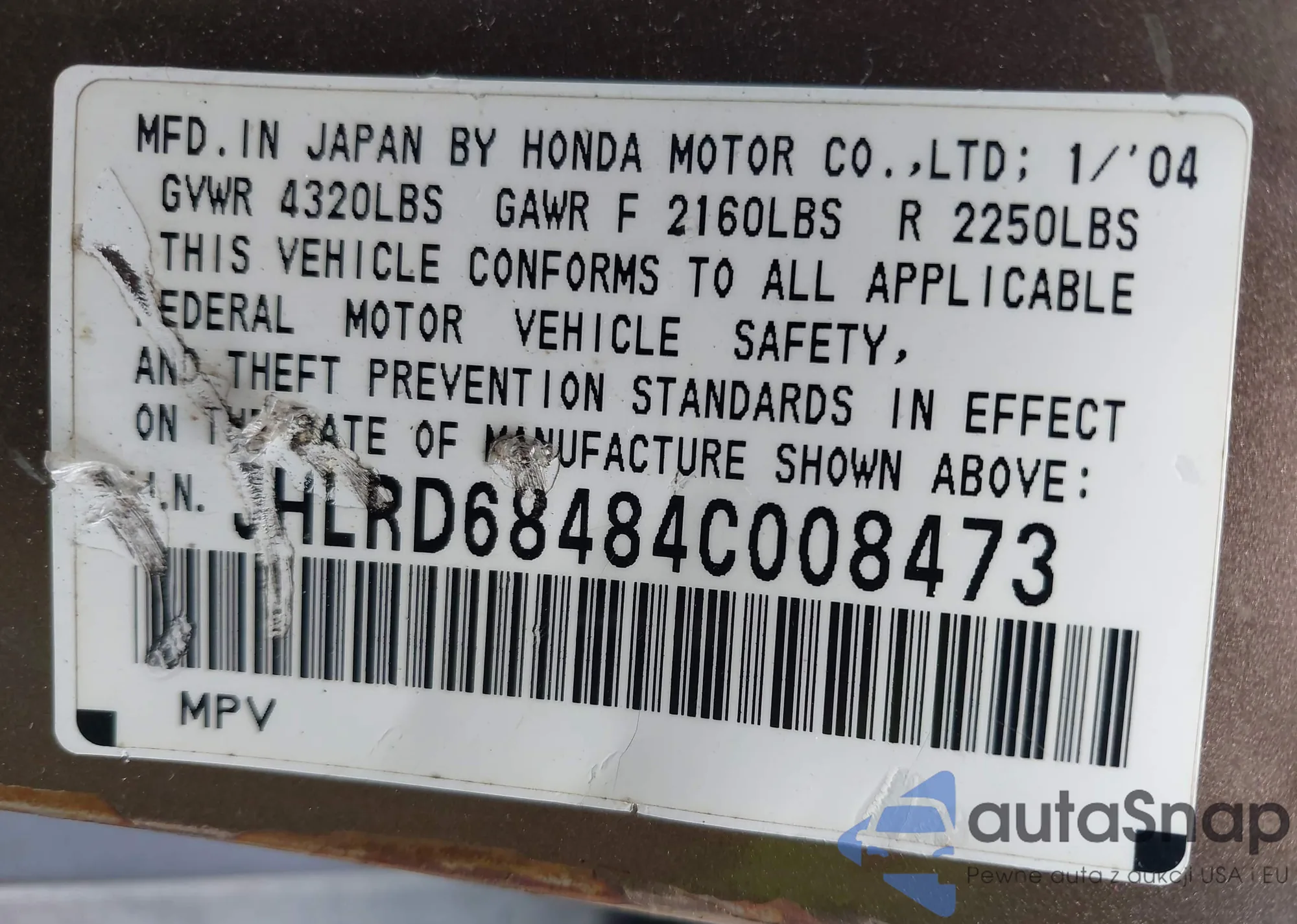 LOT: 43465195 VIN: 1HGCM56447A178072