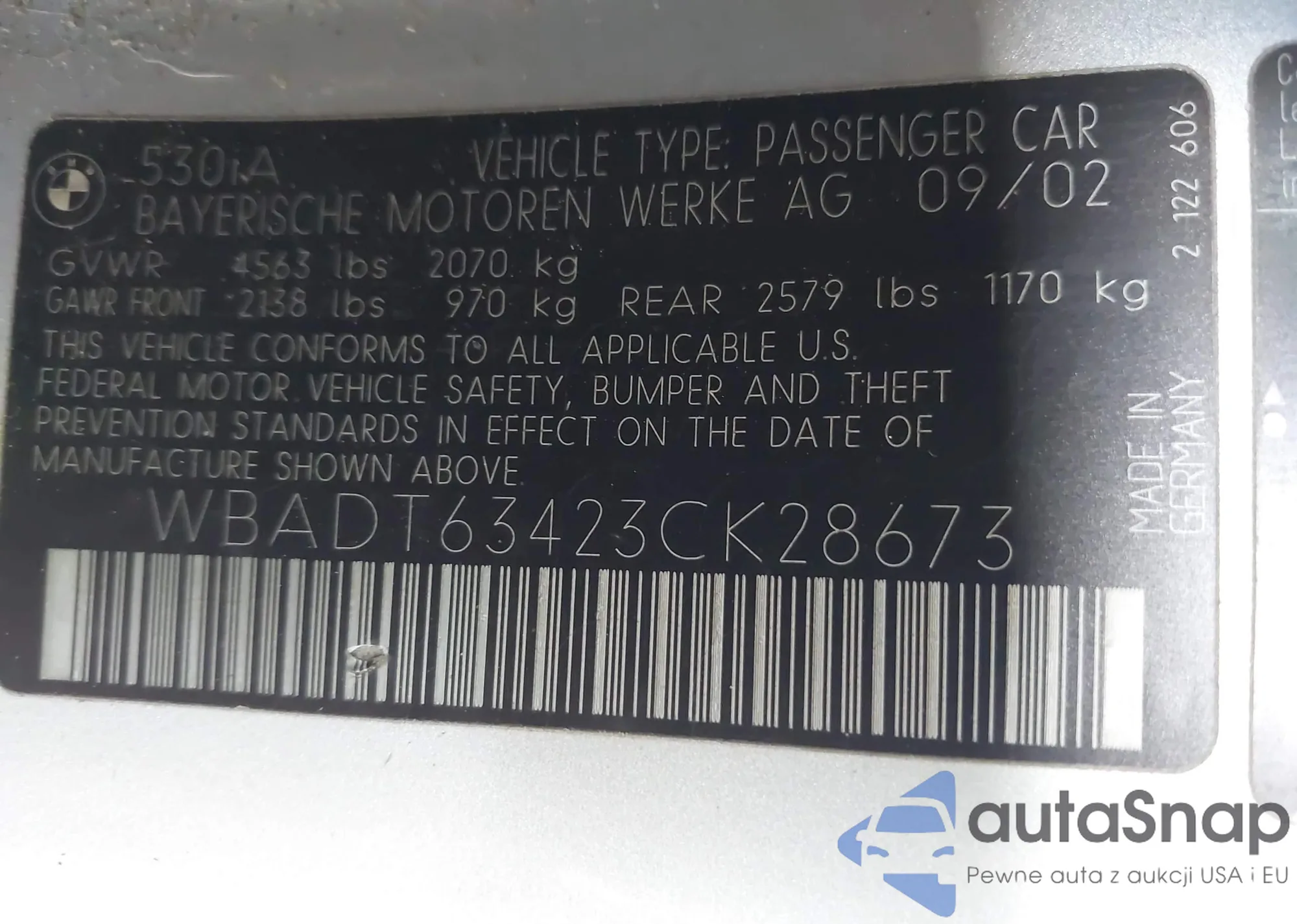 2003 BMW 530Ia from USA, damaged, VIN WBADT63423CK28673