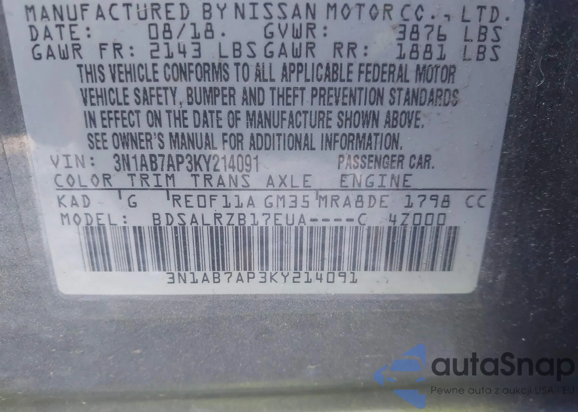 LOT: 43382013 VIN: 1G1PC5SB9D7318349