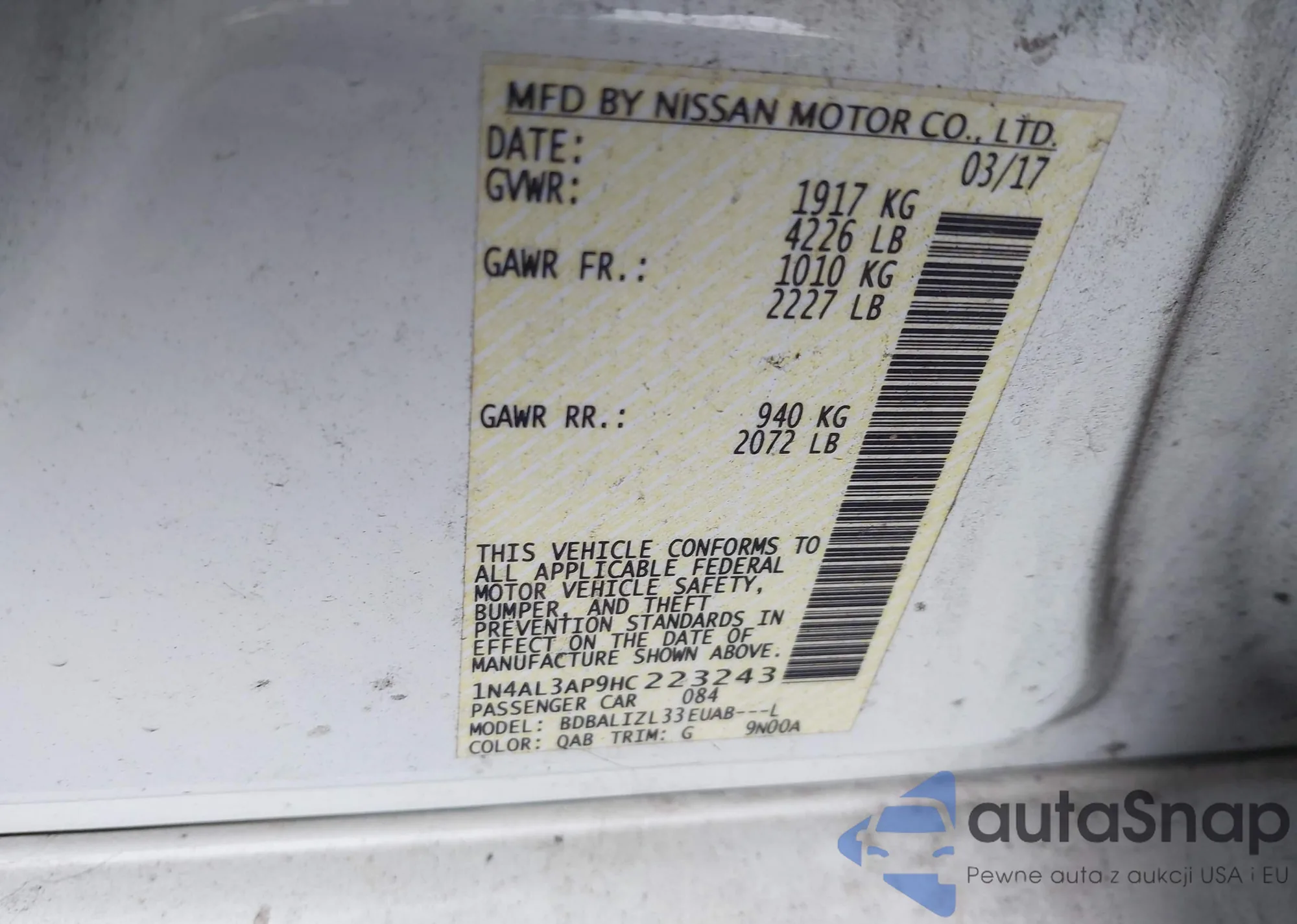 • VIN 1N4AL3AP9HC223243