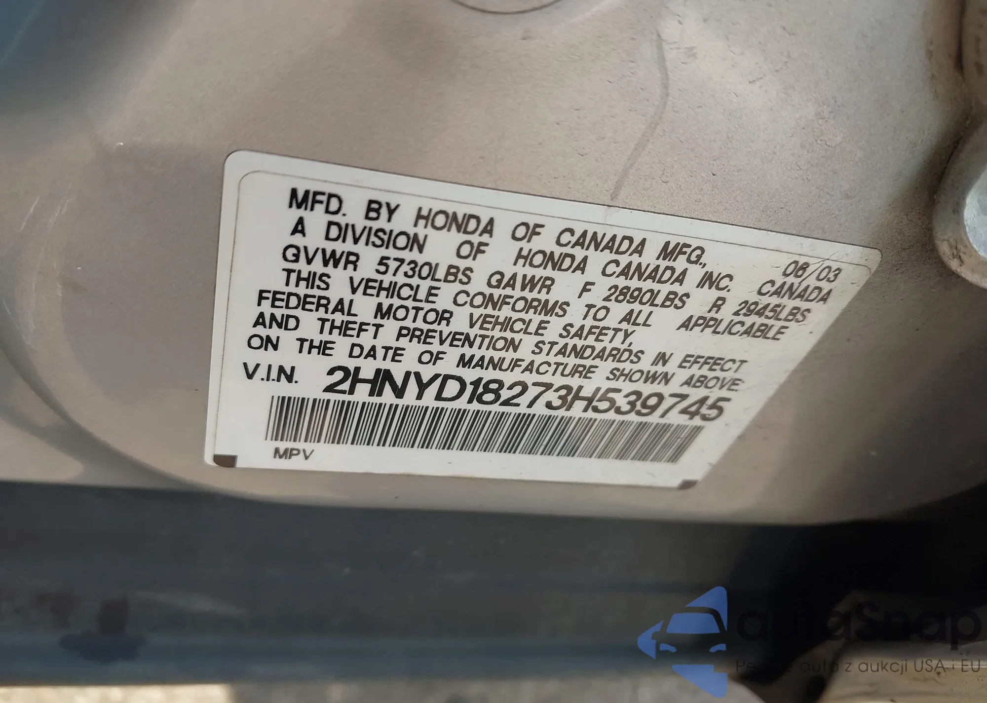 LOT: 43059523 VIN: 2HNYD18273H539745