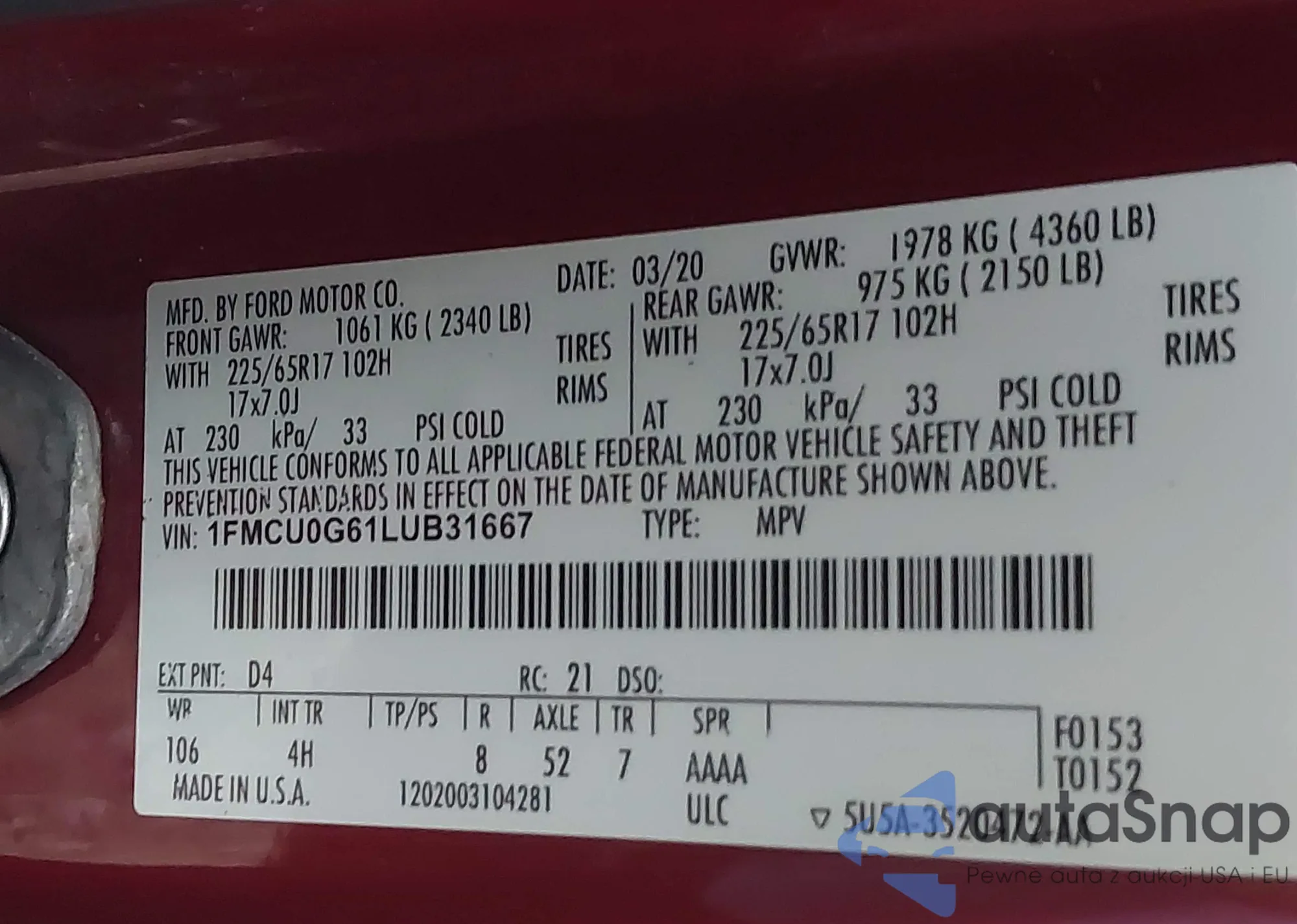 • VIN 1FMCU0G61LUB31667