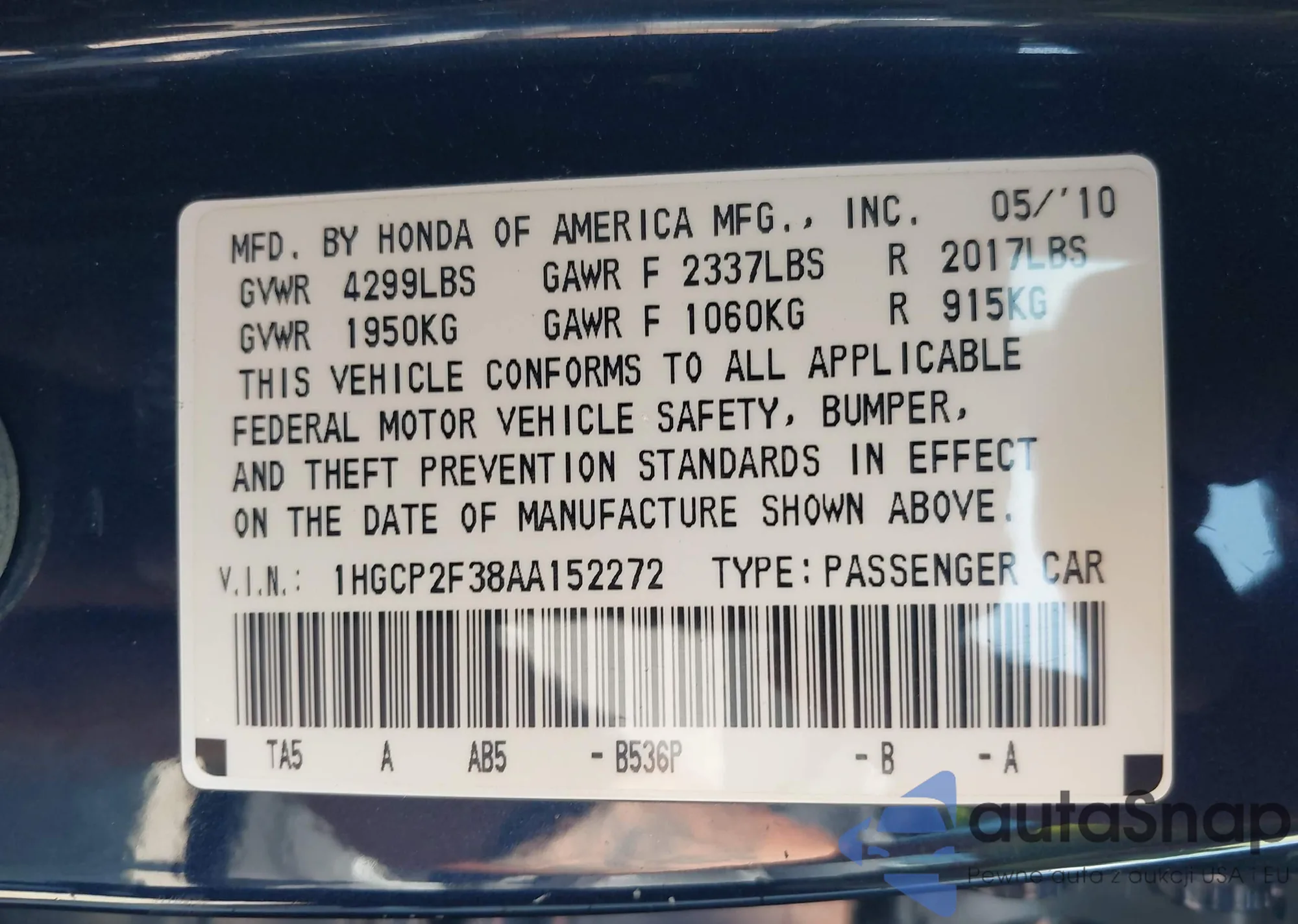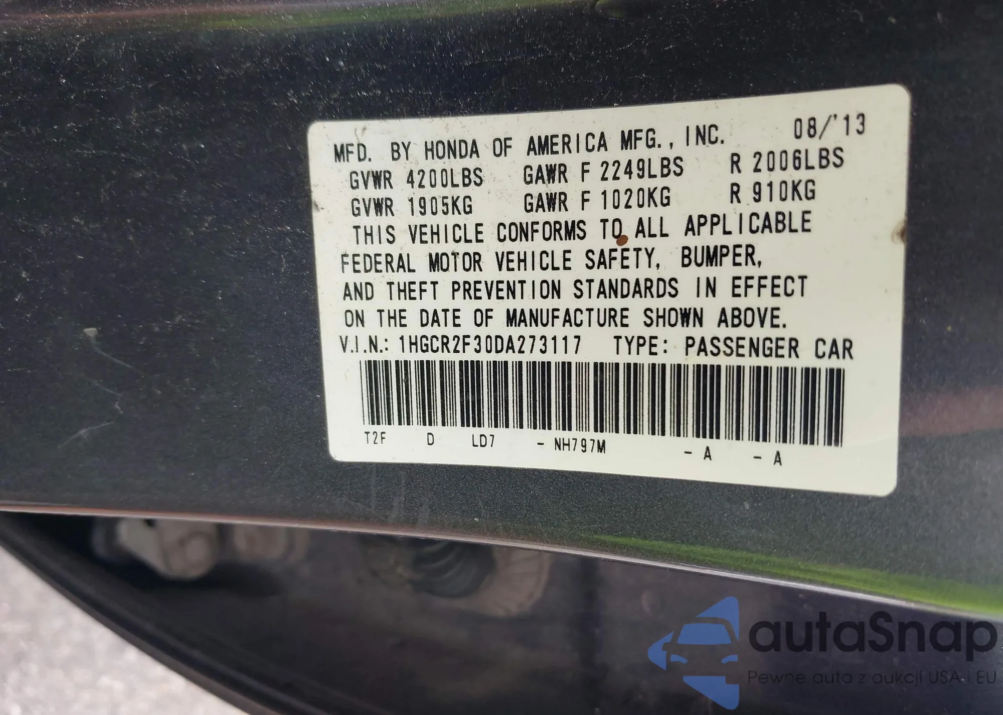 LOT: 43061093 VIN: 1HGCR2F30DA273117