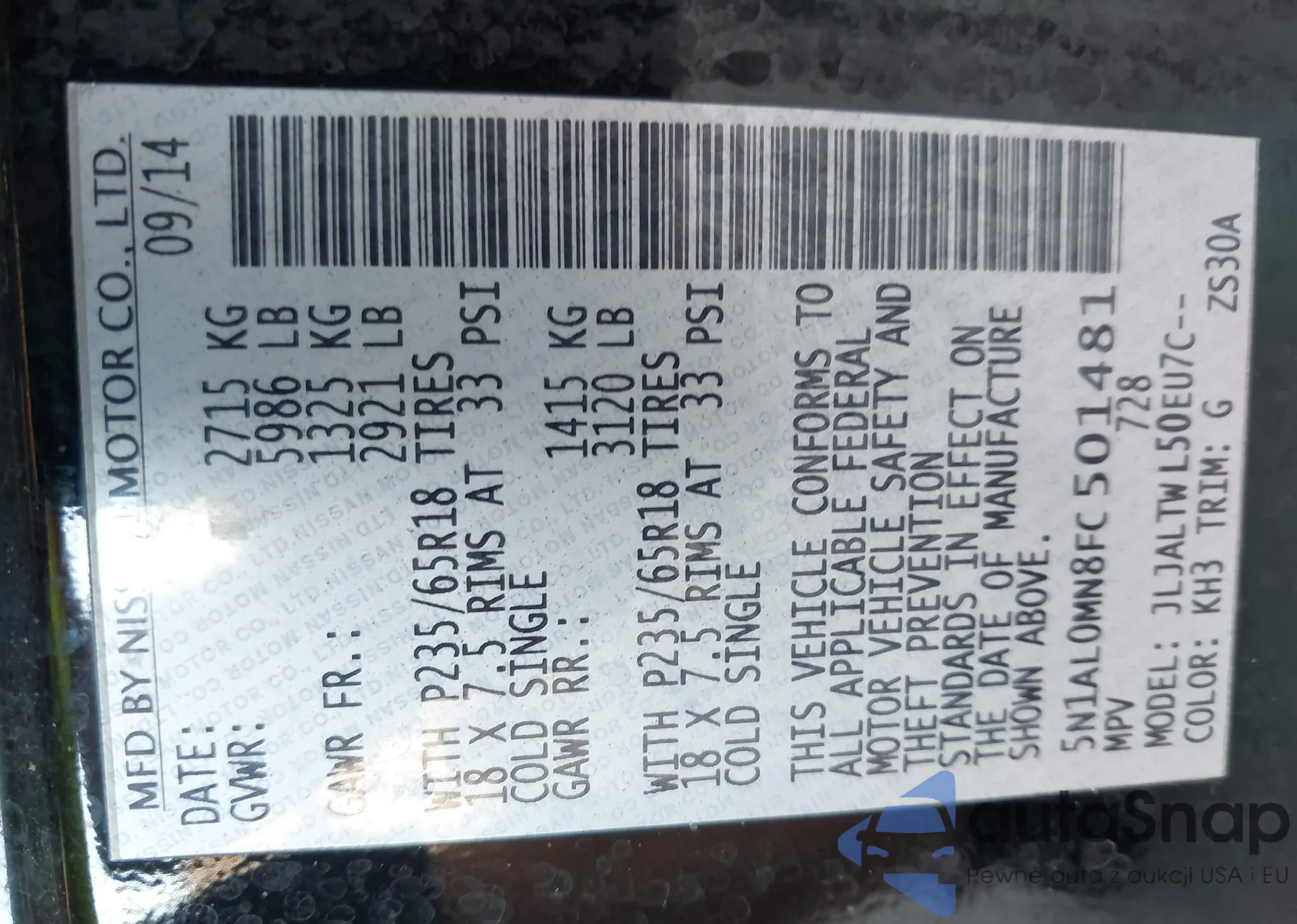 • VIN 5N1AL0MN8FC501481