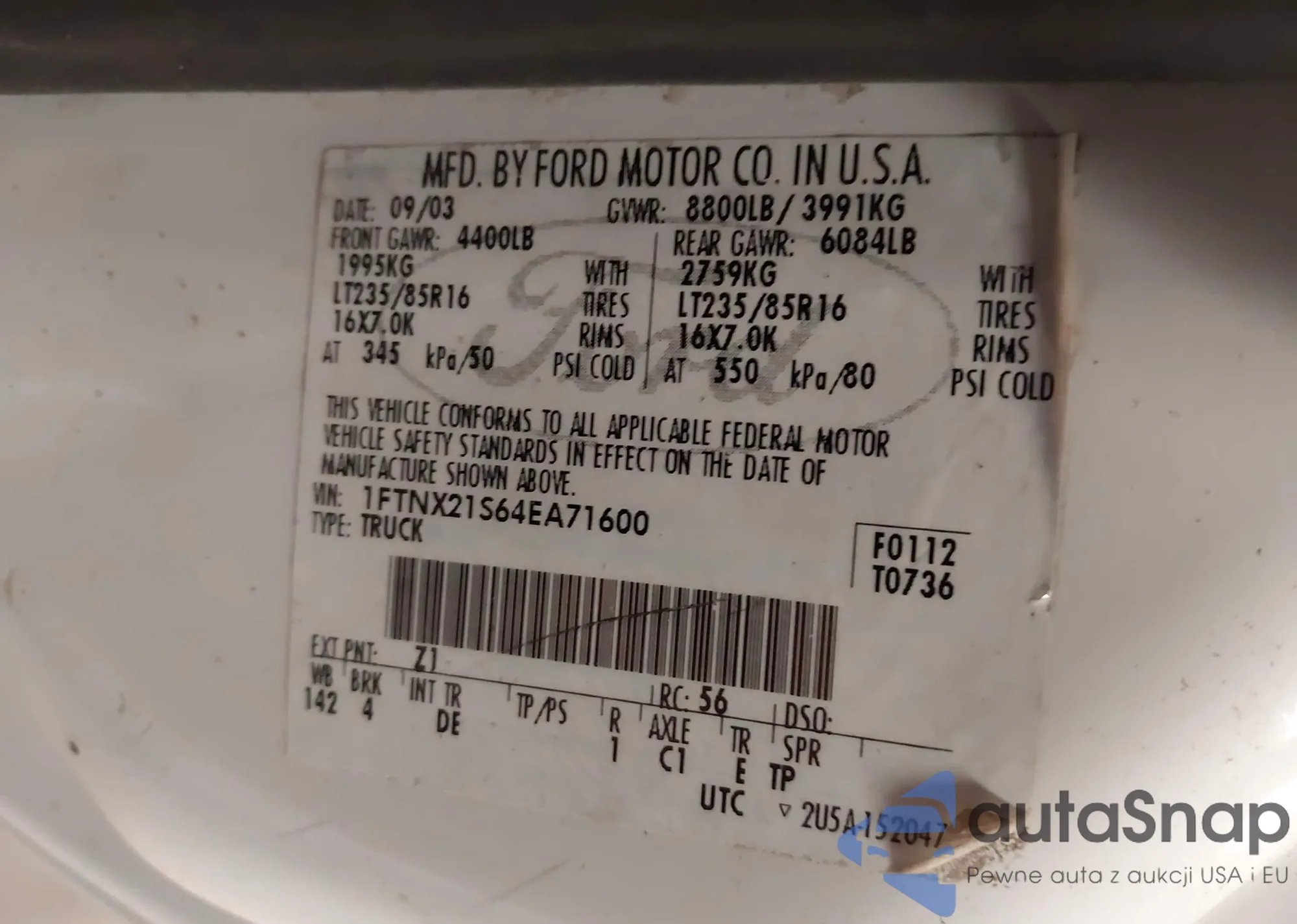 LOT: 42962388 VIN: 1FTNX21S64EA71600