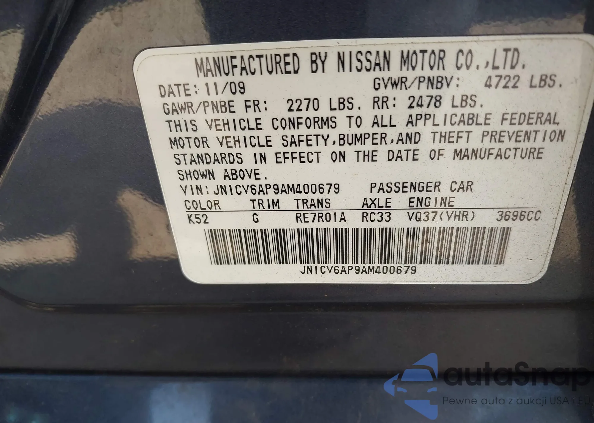 LOT: 43181046 VIN: JN1CV6AP9AM400679