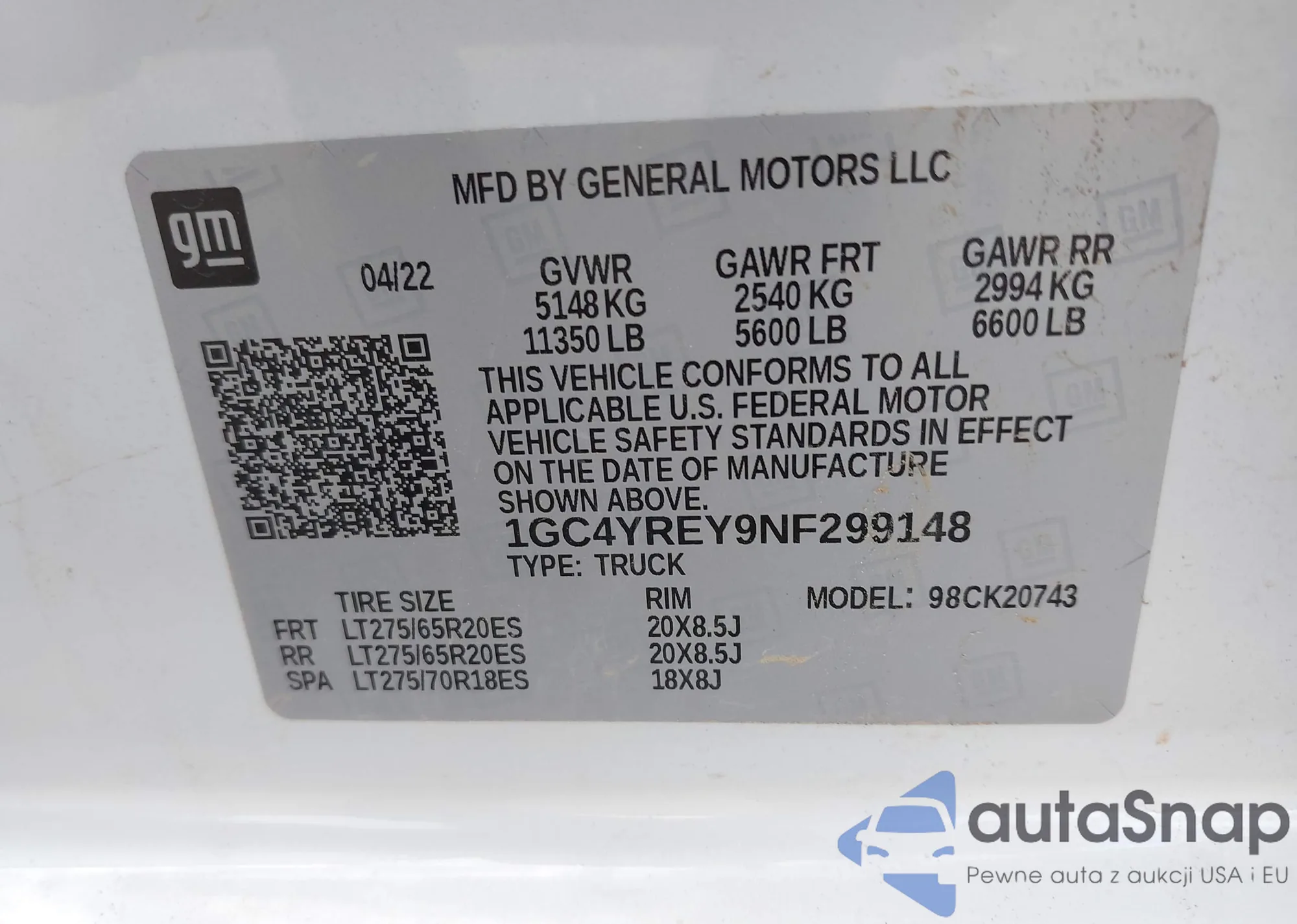 LOT: 43239837 VIN: 1GC4YREY9NF299148