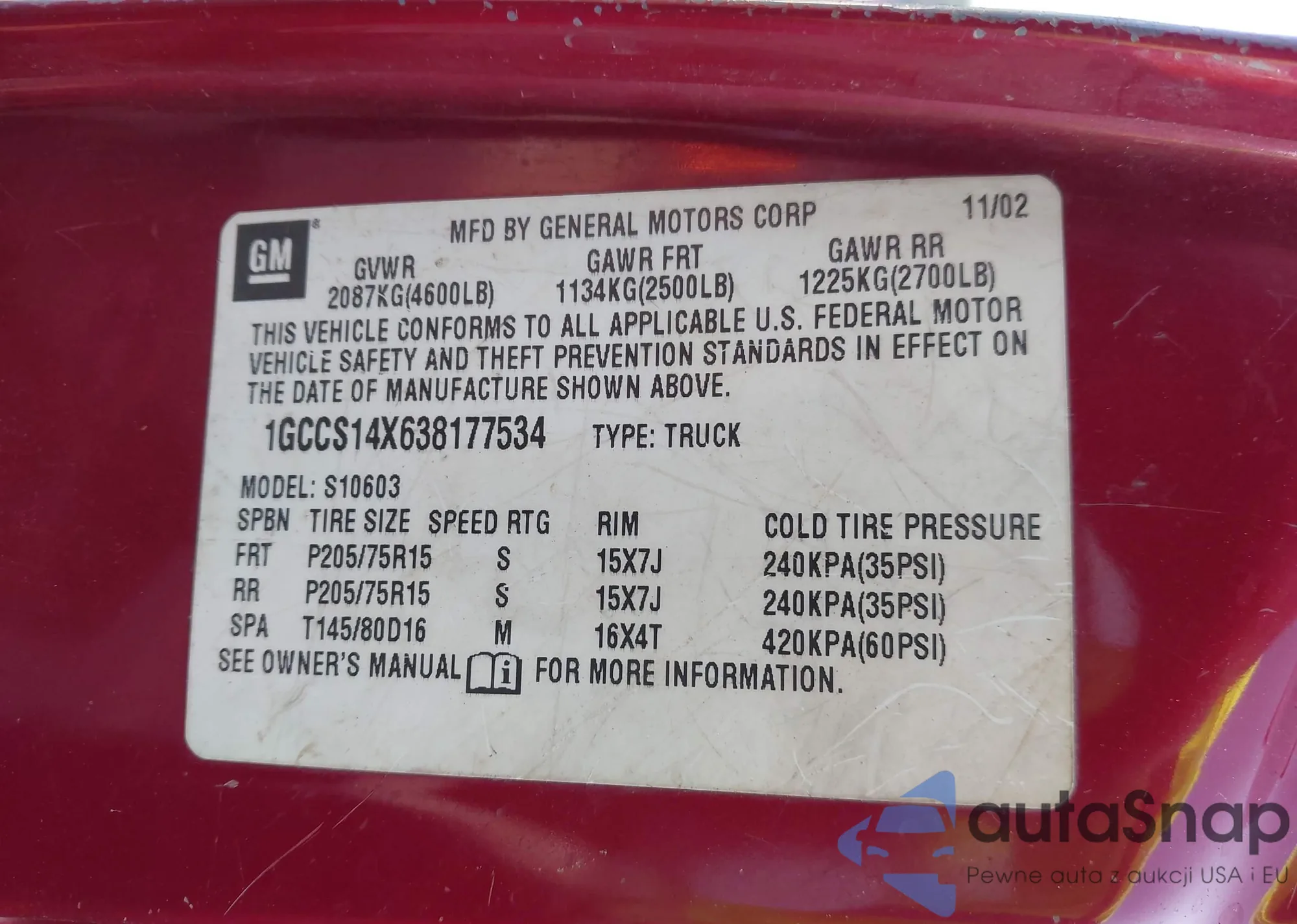 • VIN 1GCCS14X638177534