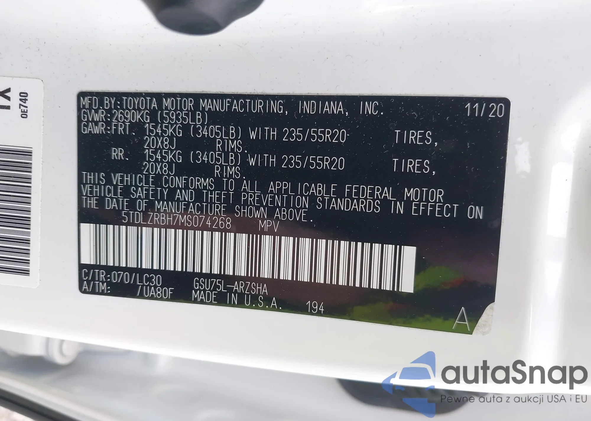 LOT: 42873732 VIN: 5TDLZRBH7MS074268