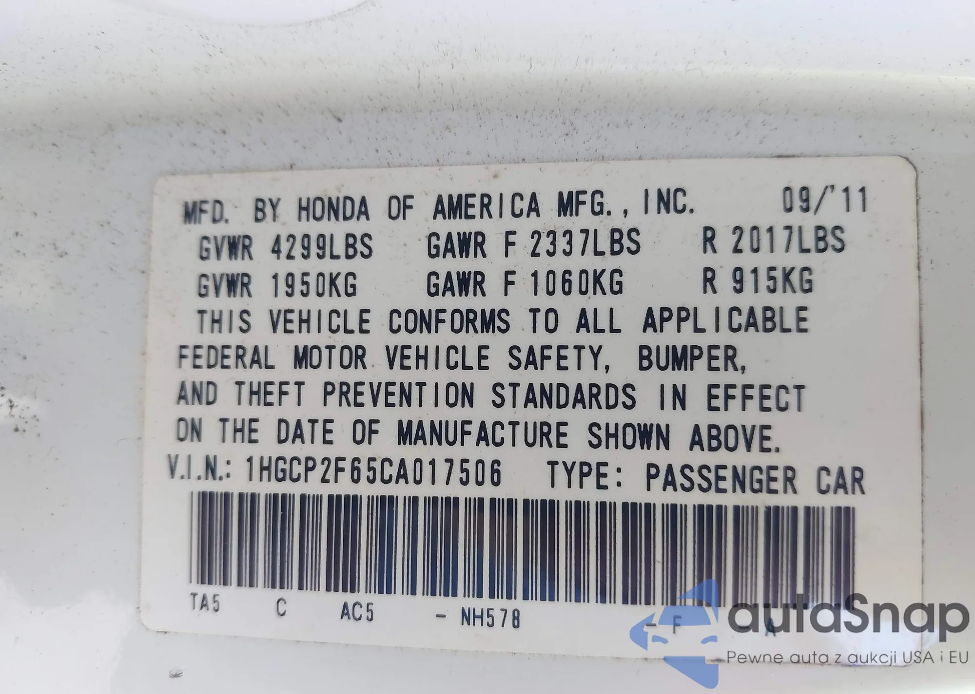 LOT: 43172672 VIN: 1HGCP2F65CA017506