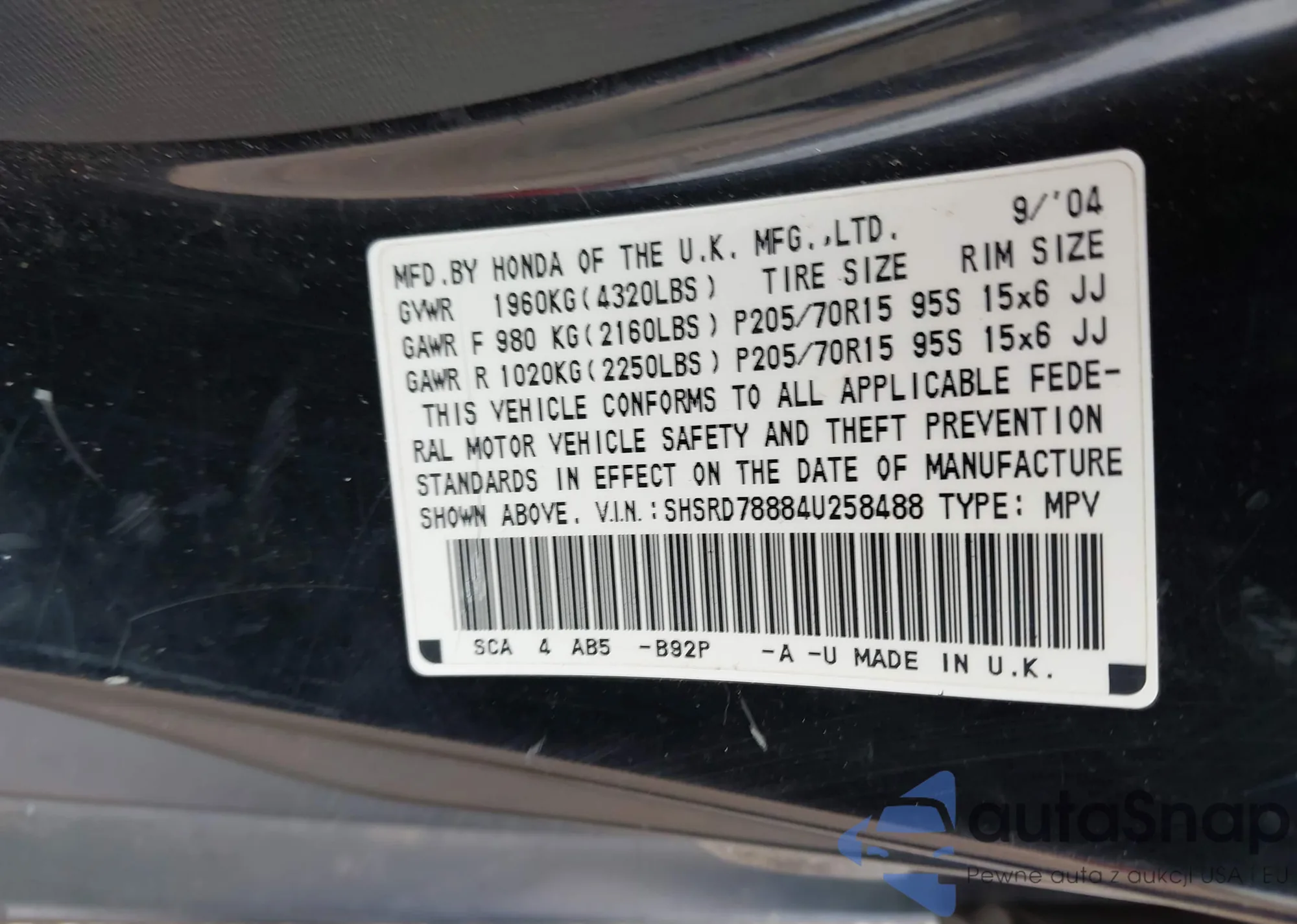 • VIN SHSRD78884U258488