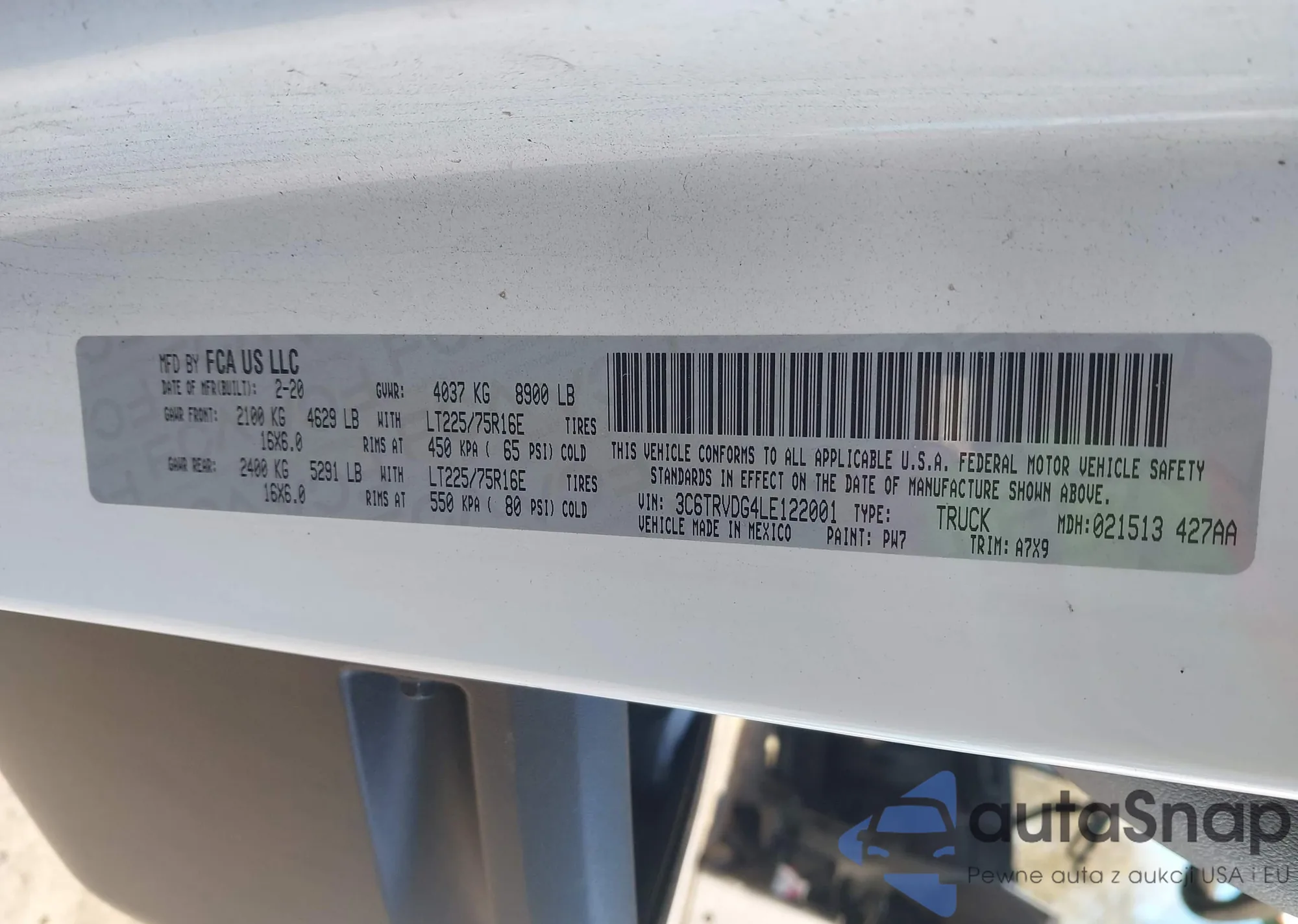 LOT: 43704955 VIN: 3C6TRVDG4LE122001
