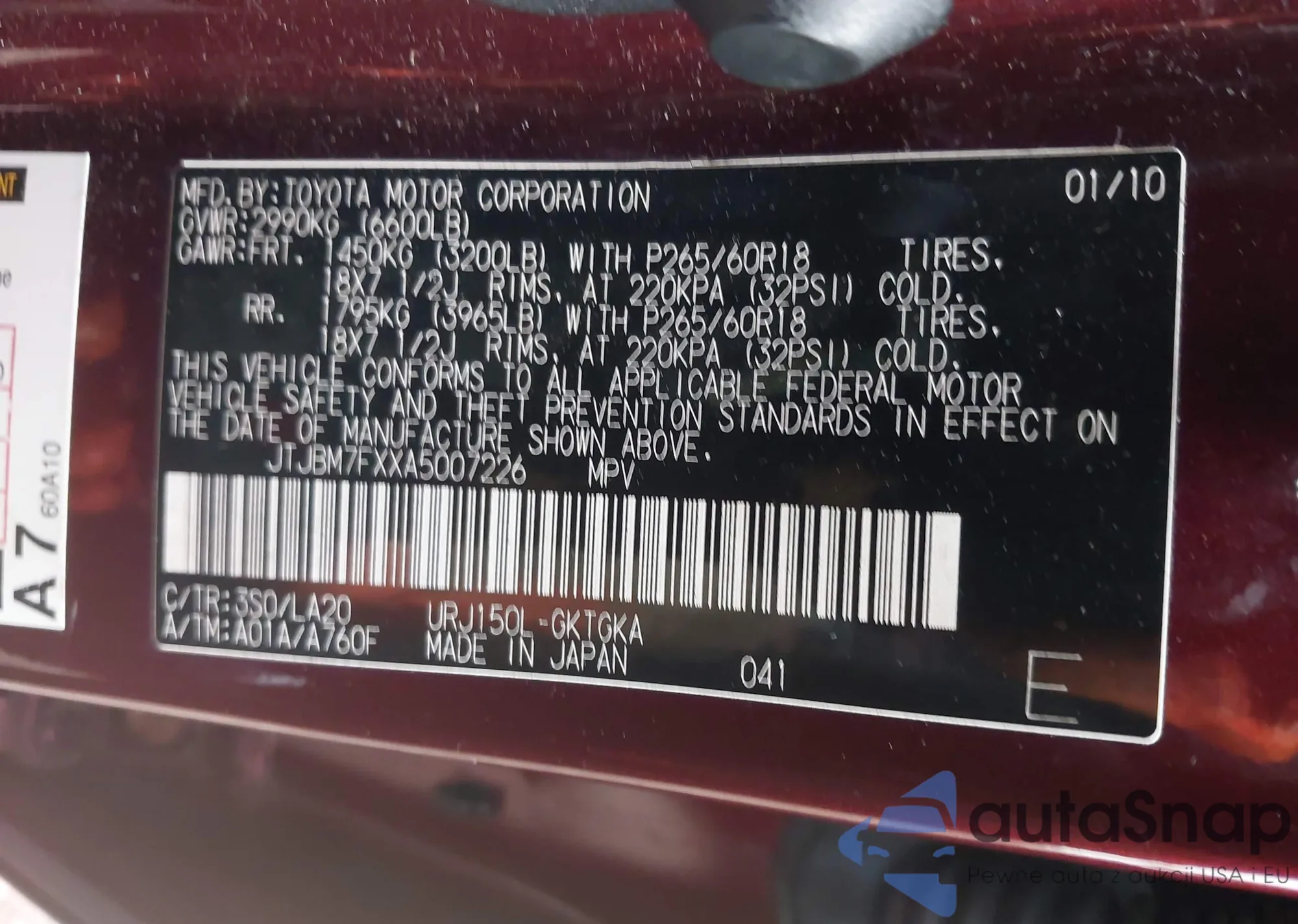 LOT: 43701899 VIN: 5TFAZ5CN0MX103060