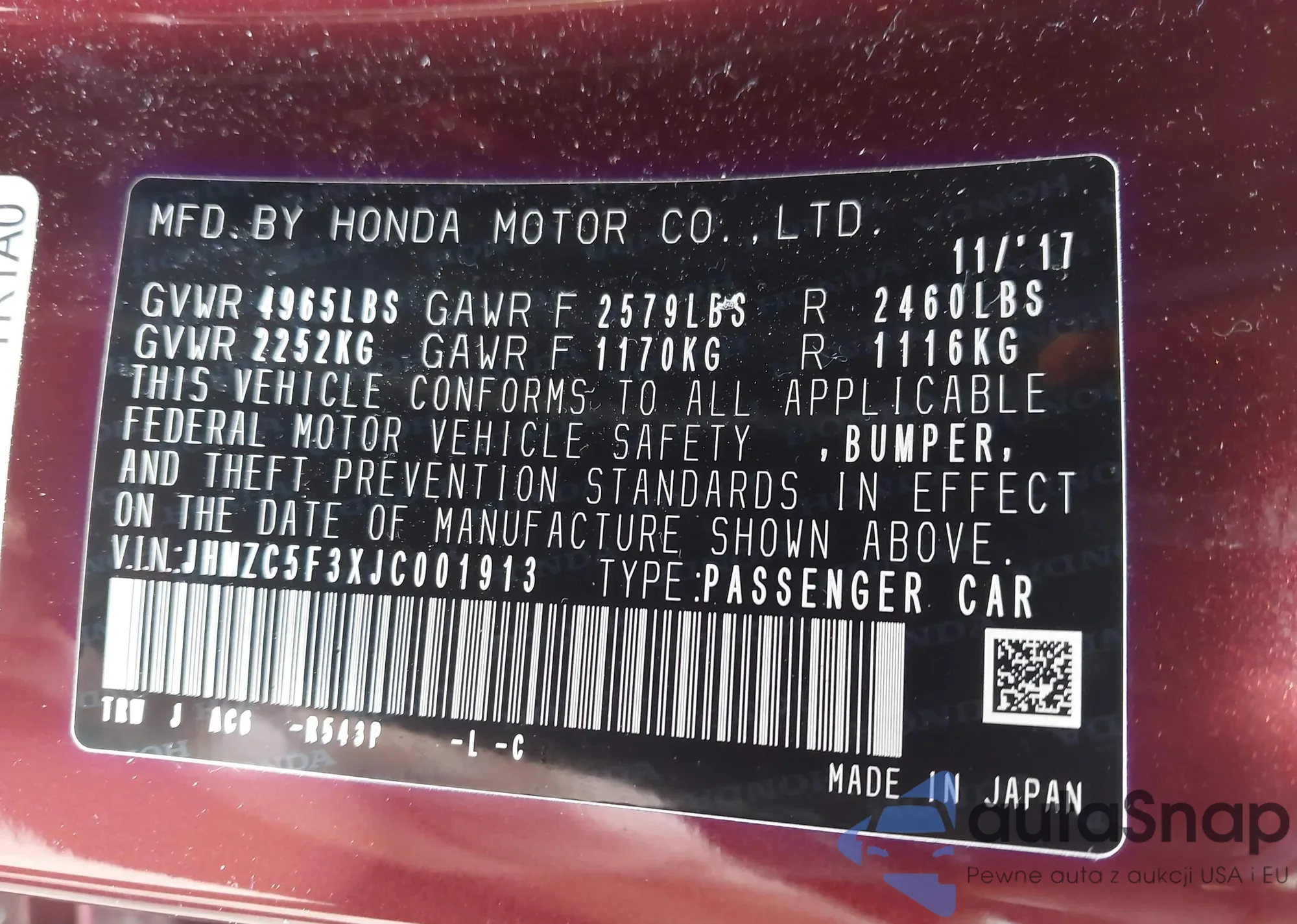 LOT: 43301103 VIN: JHMZC5F3XJC001913