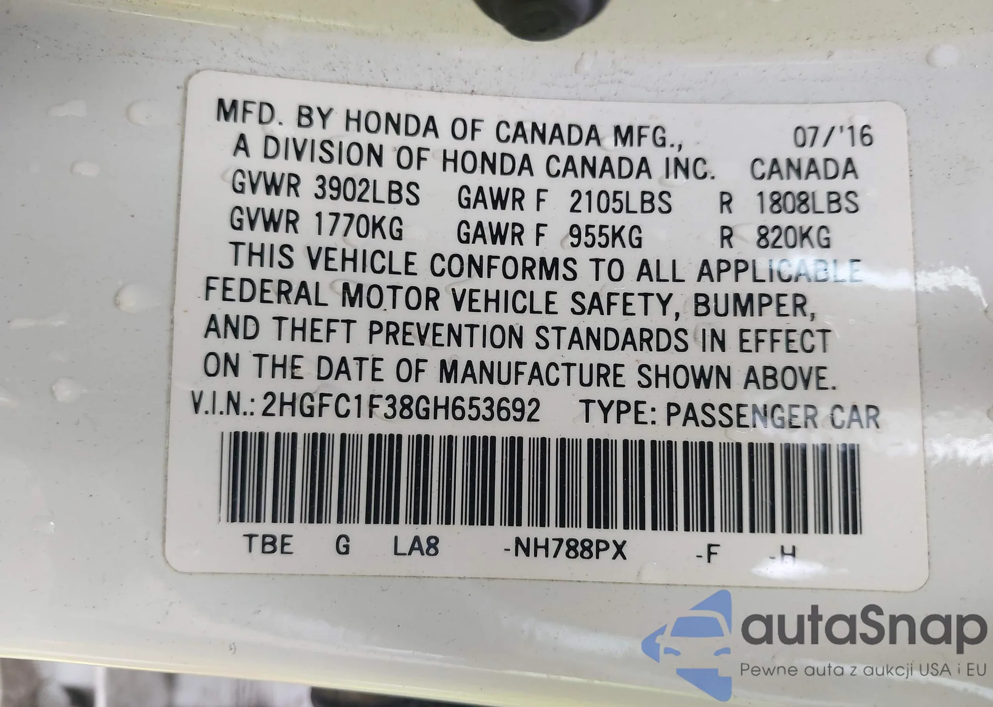 LOT: 43453606 VIN: 2HGFC1F38GH653692