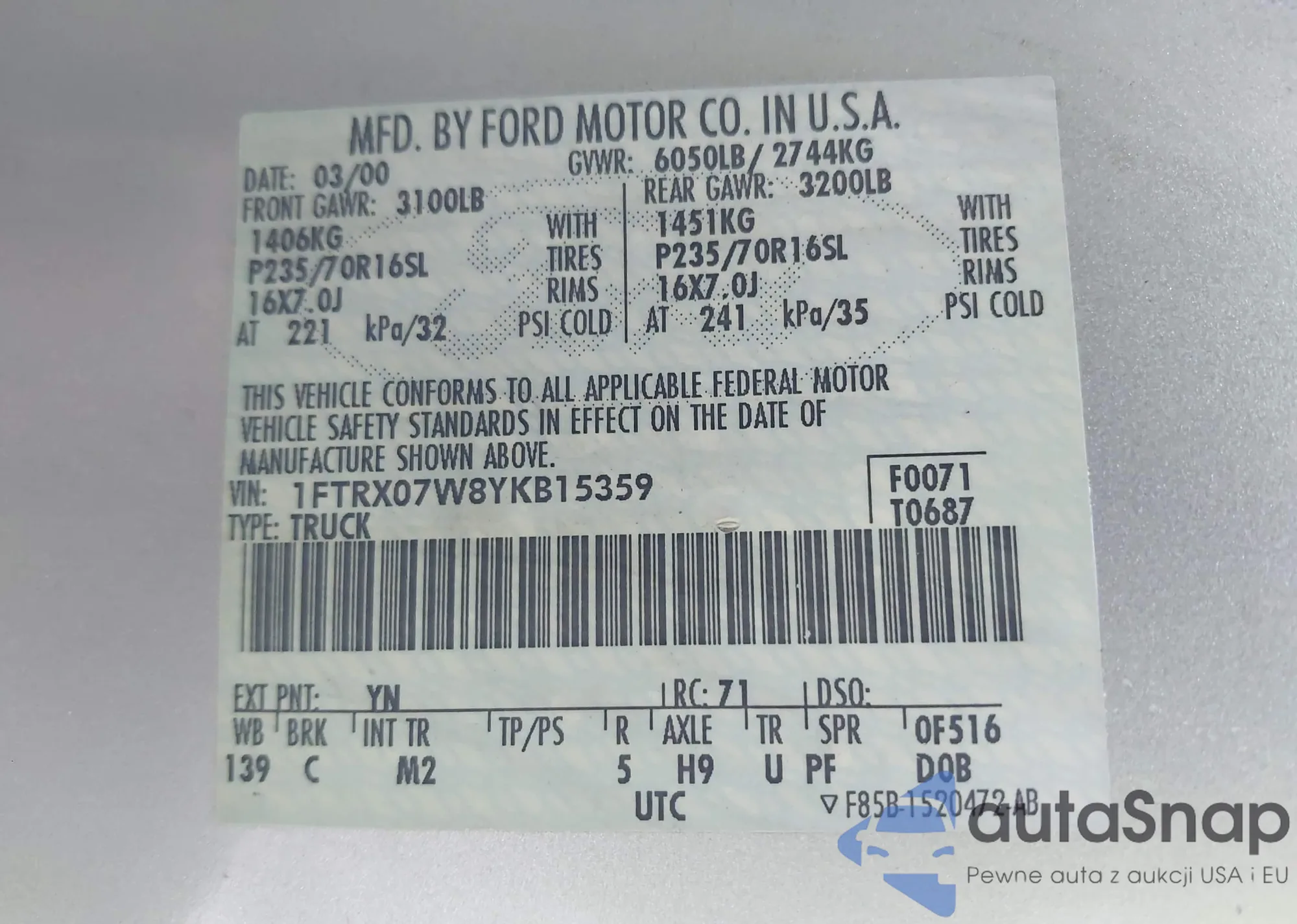 • VIN 1FTRX07W8YKB15359